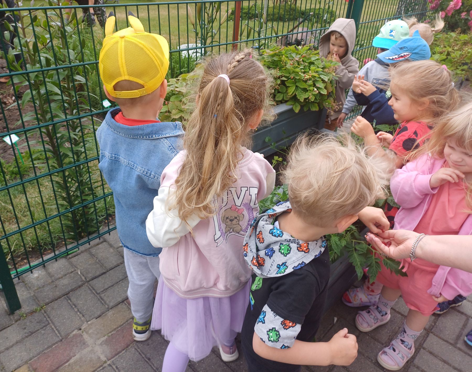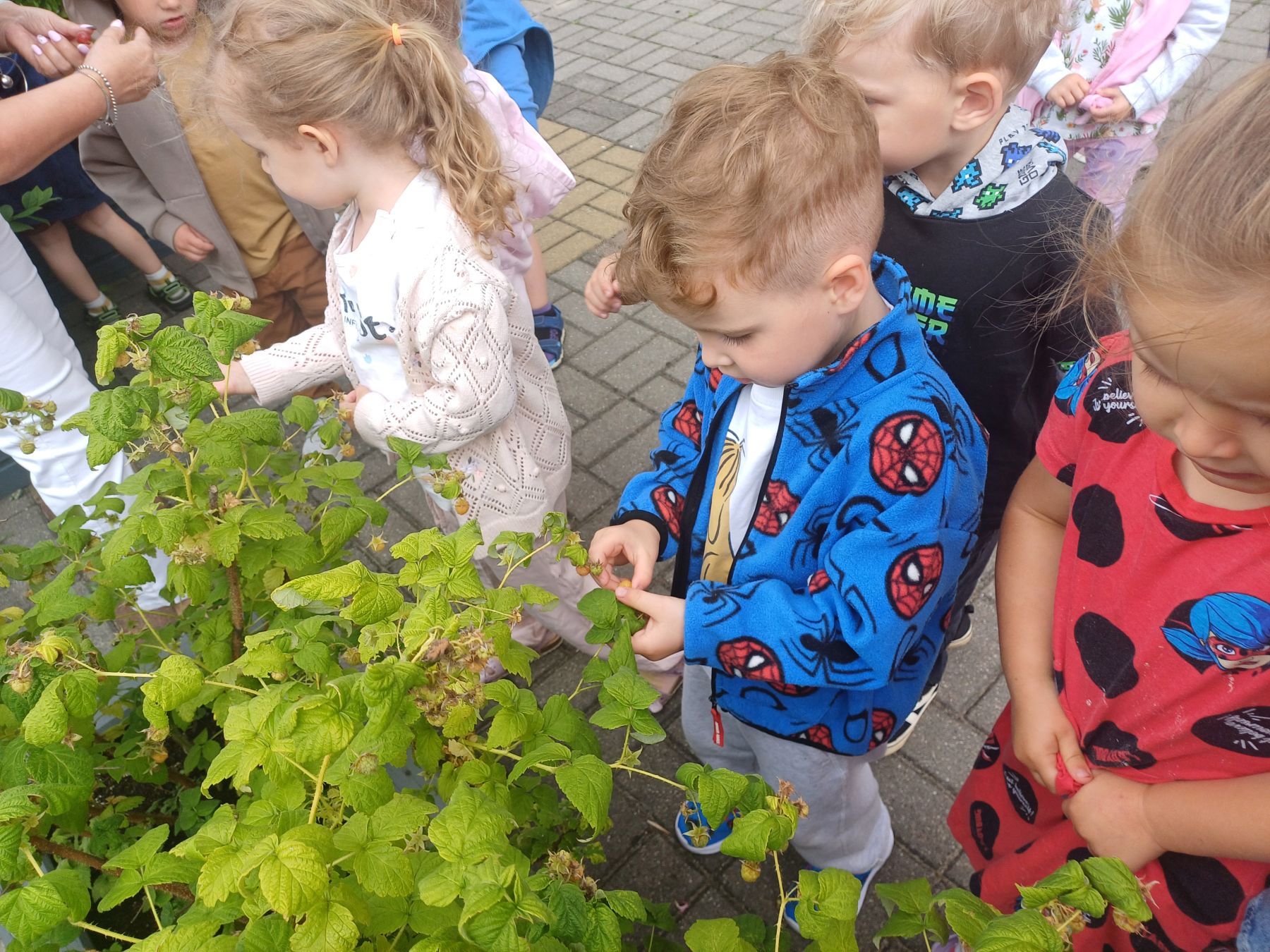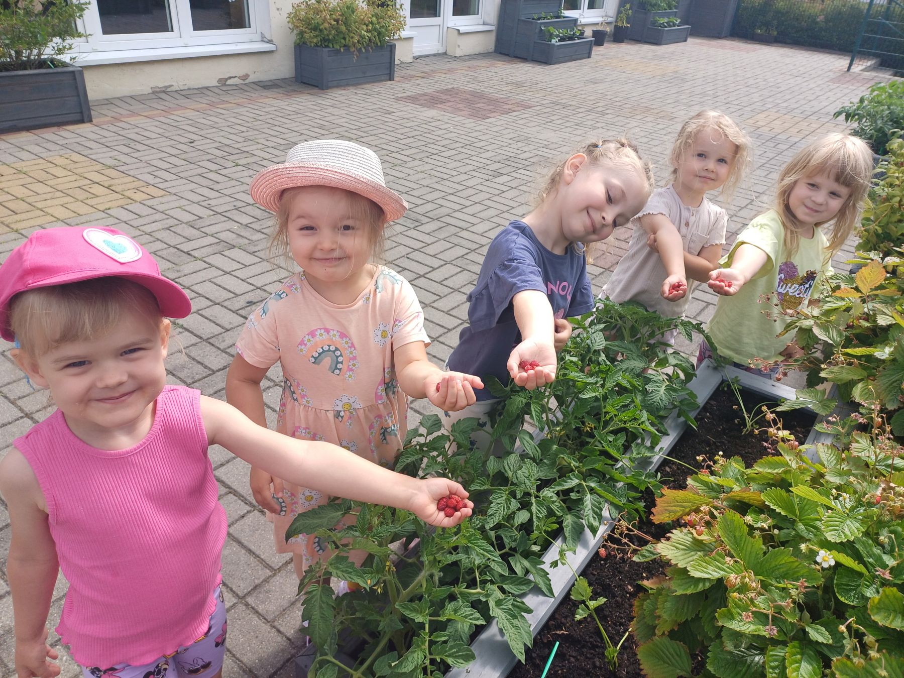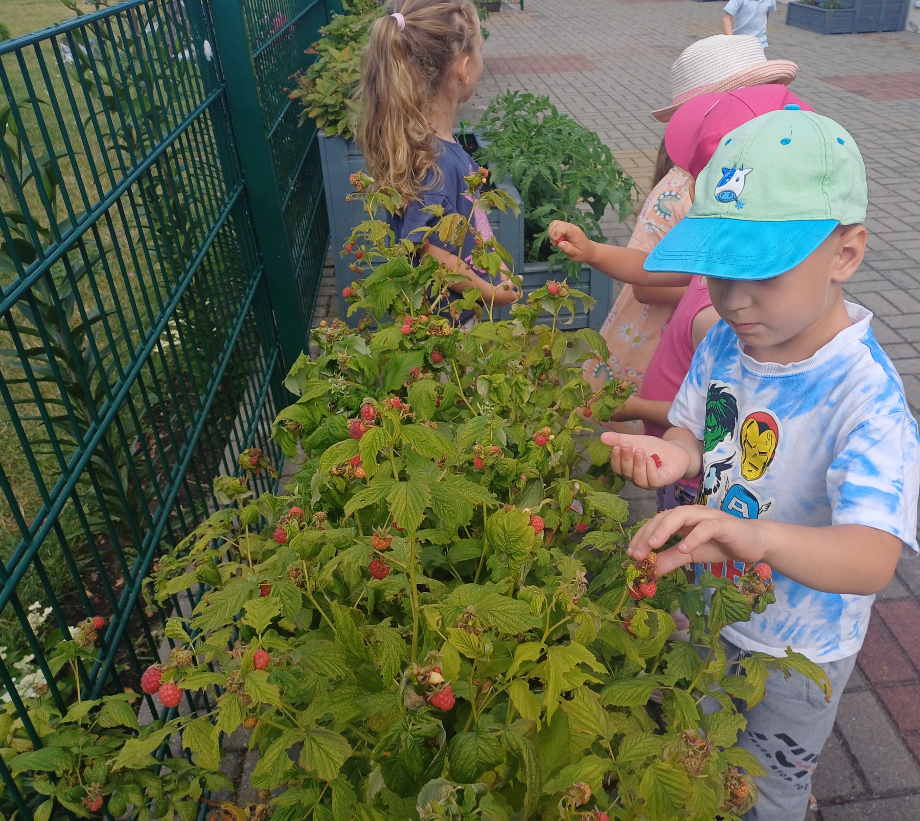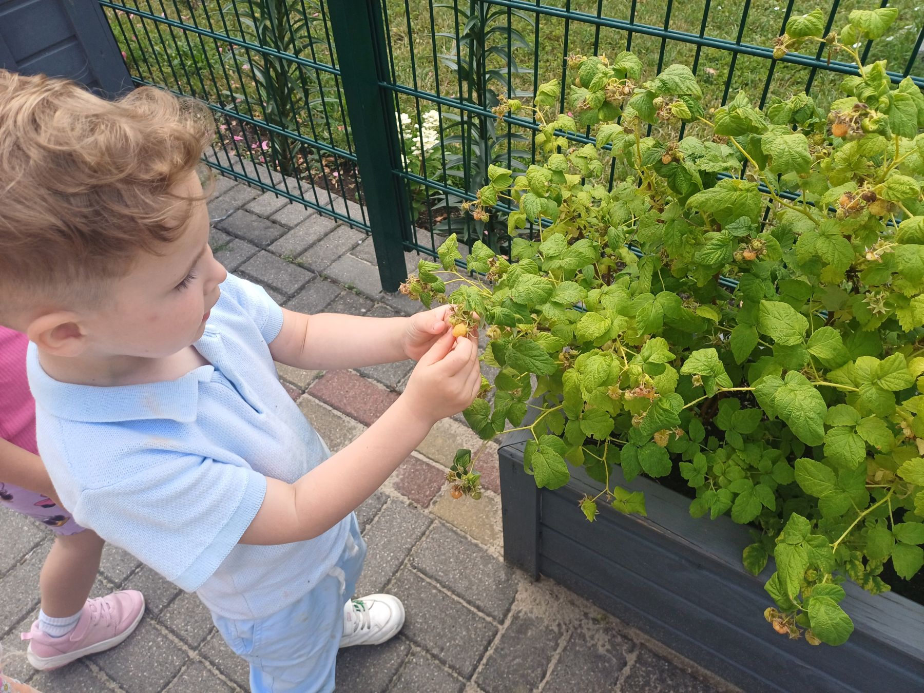 KĄCIK OWOCOWY: w którym dzieci mogą obserwować posadzone przez siebie min. truskawki, poziomki, maliny, borówki, porzeczki, agrest itp. oraz systematycznie je pielęgnować i kosztować ze smakiem owoce swojej wytężonej pracy.