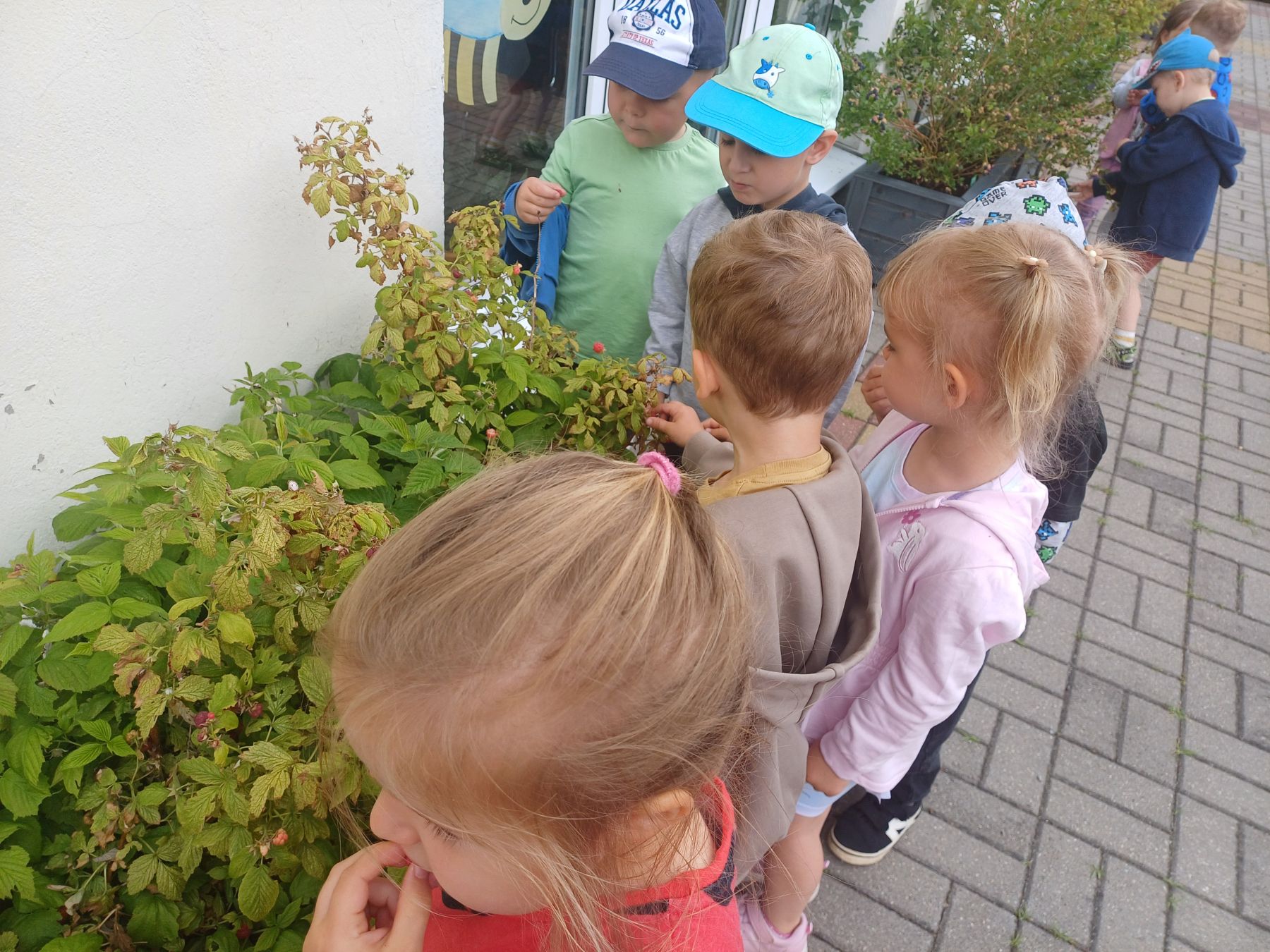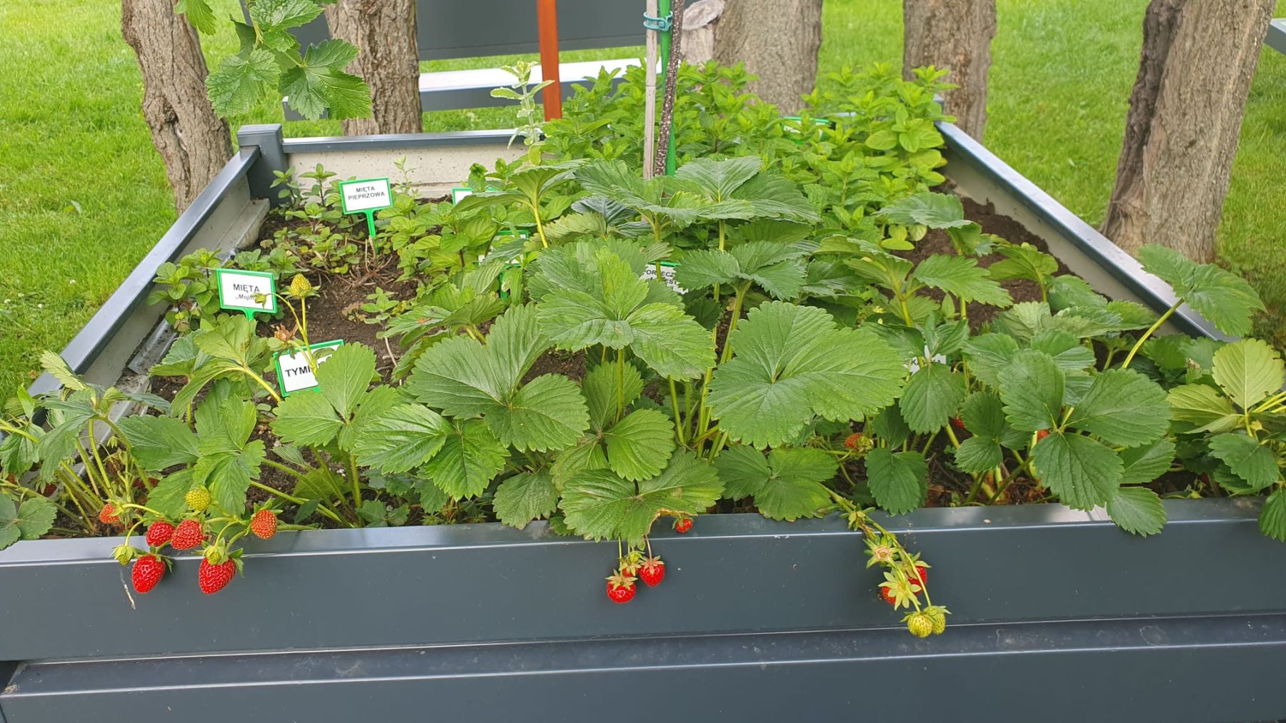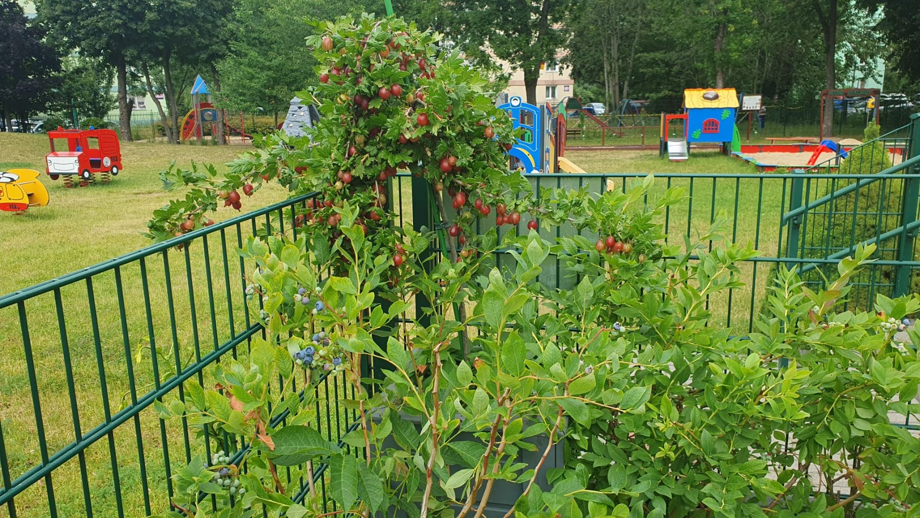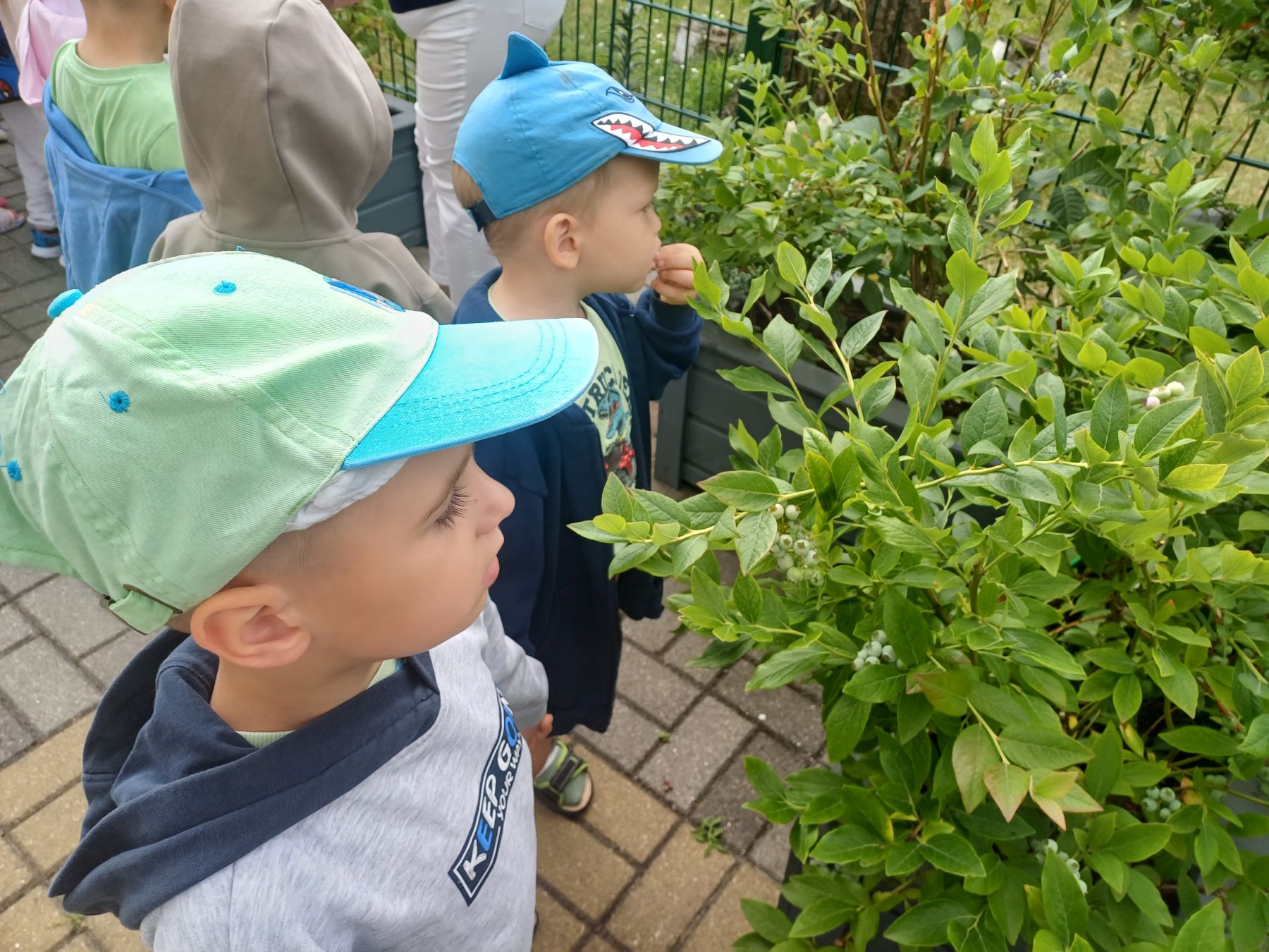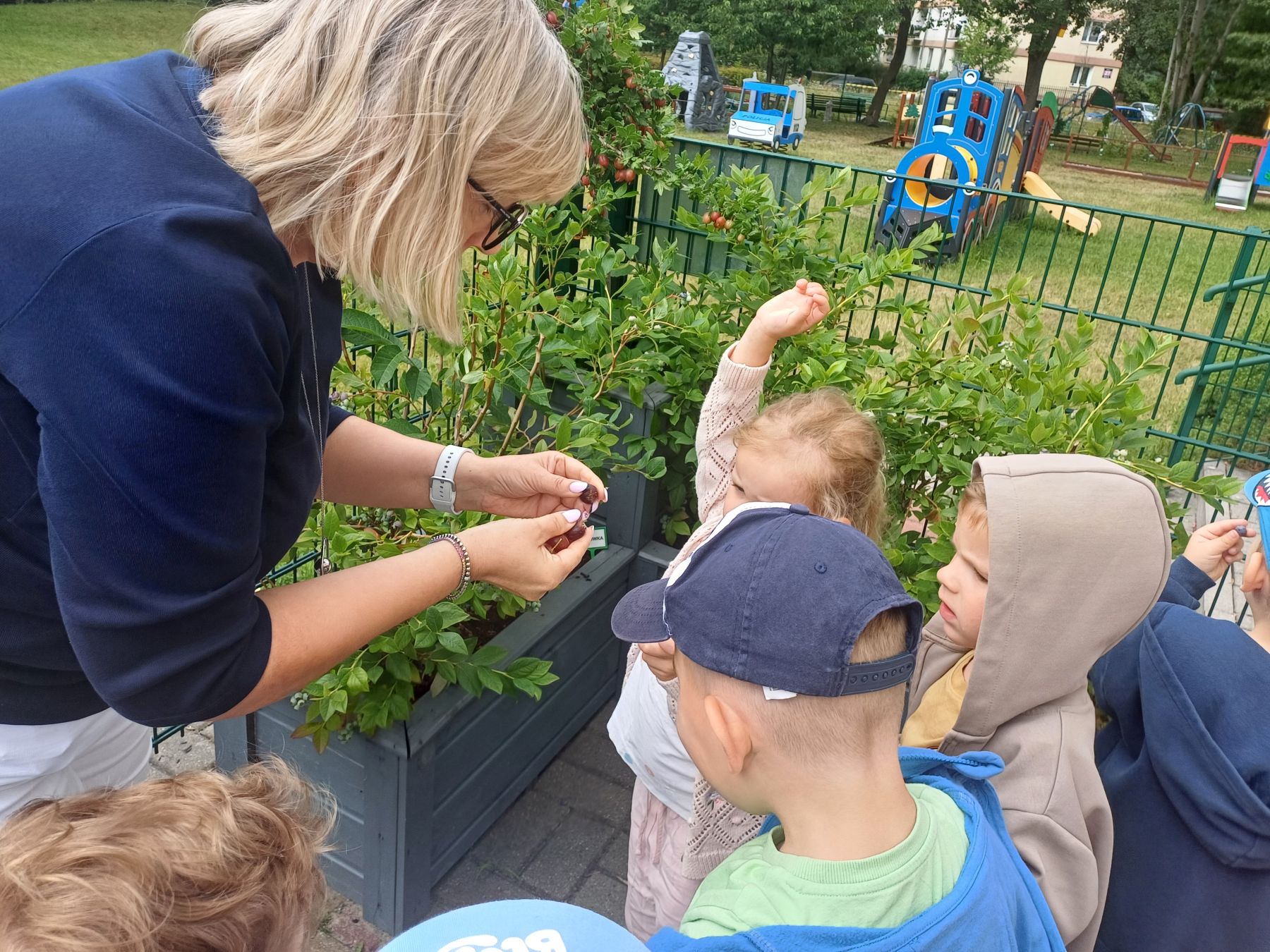 KĄCIK OWOCOWY: w którym dzieci mogą obserwować posadzone przez siebie min. truskawki, poziomki, maliny, borówki, porzeczki, agrest itp. oraz systematycznie je pielęgnować i kosztować ze smakiem owoce swojej wytężonej pracy.