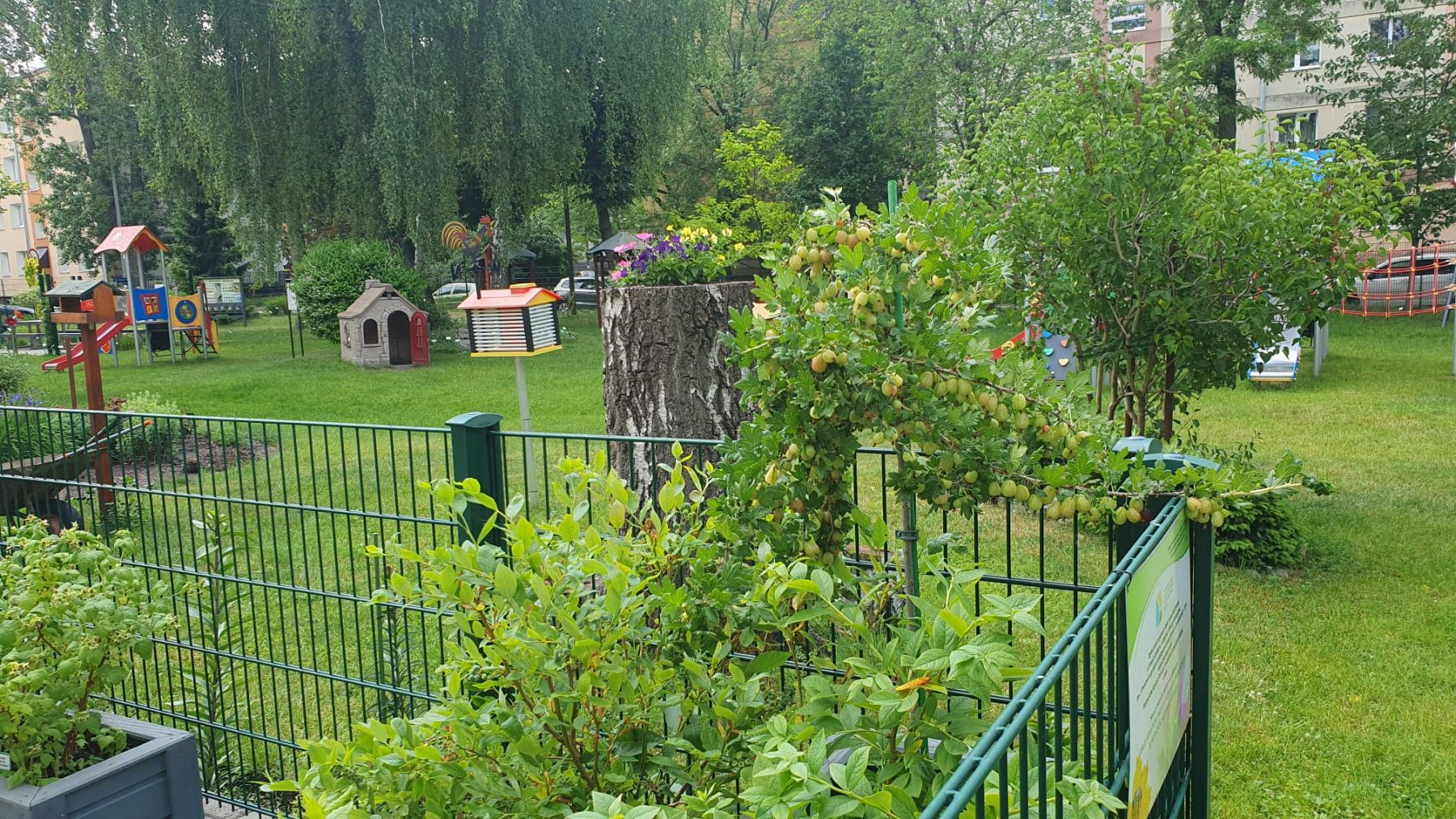 KĄCIK ZIOŁOWY: to pachnąca i bardzo aromatyczna rabata, na której dzieci hodują wiele różnorodnych ziół - majeranek, oregano, miętę, kolendrę, bazylię – a następnie zbierają je, suszą, aby panie kucharki mogły używać ich w przedszkolnej kuchni przez cały rok.