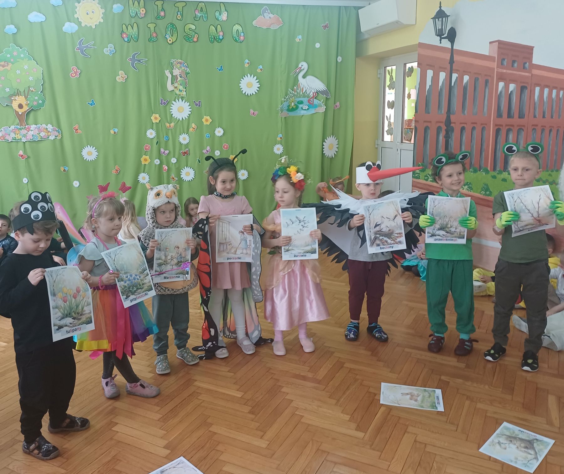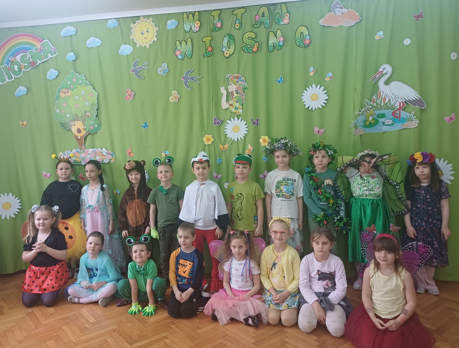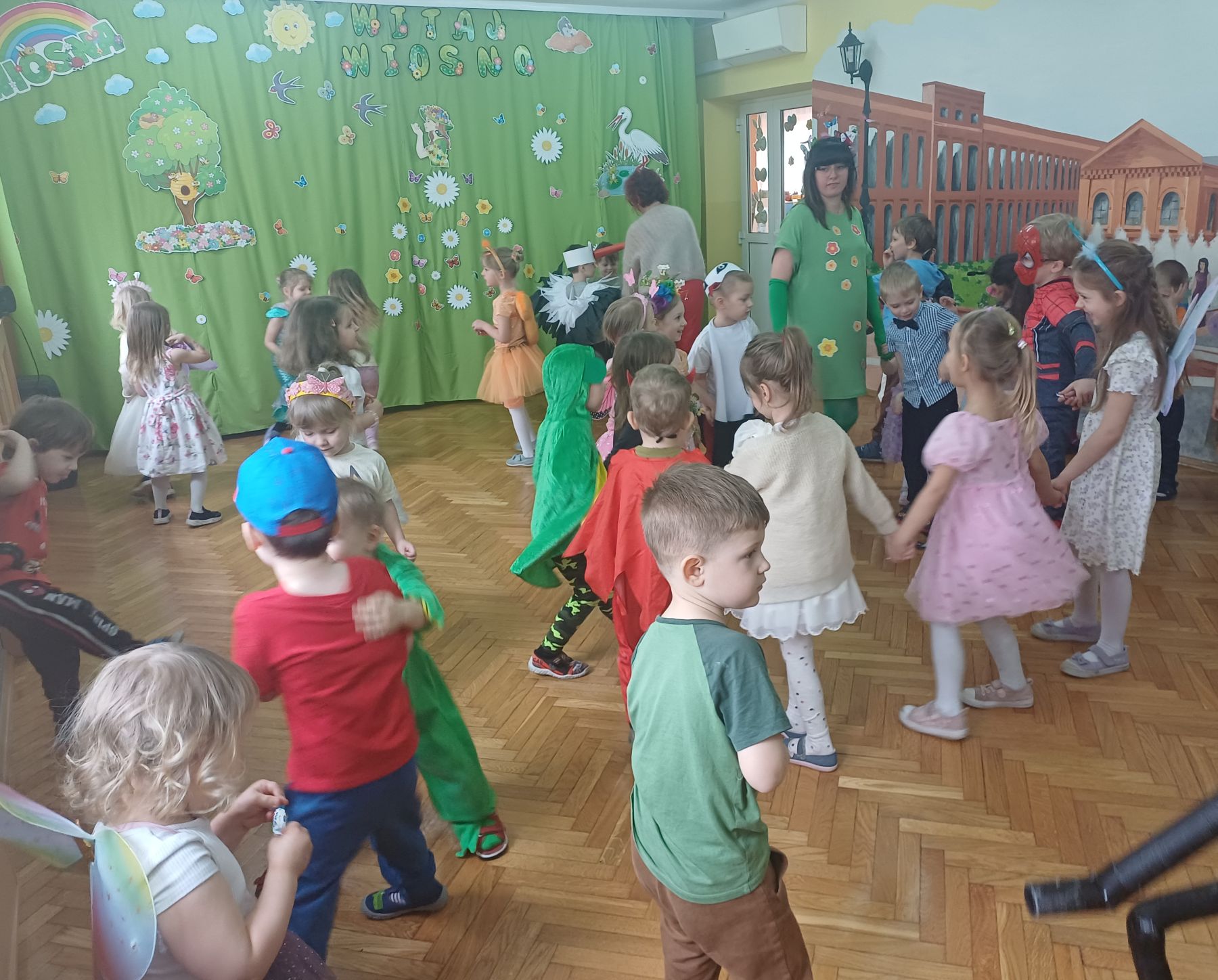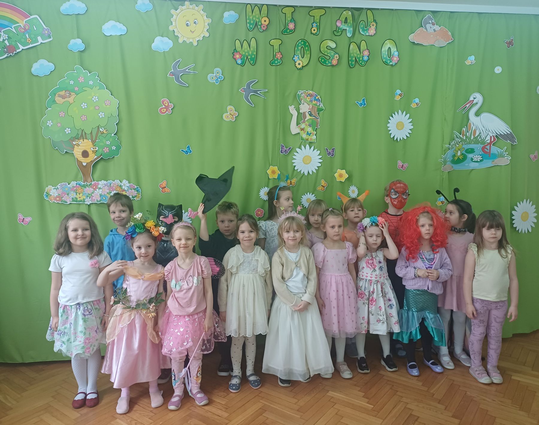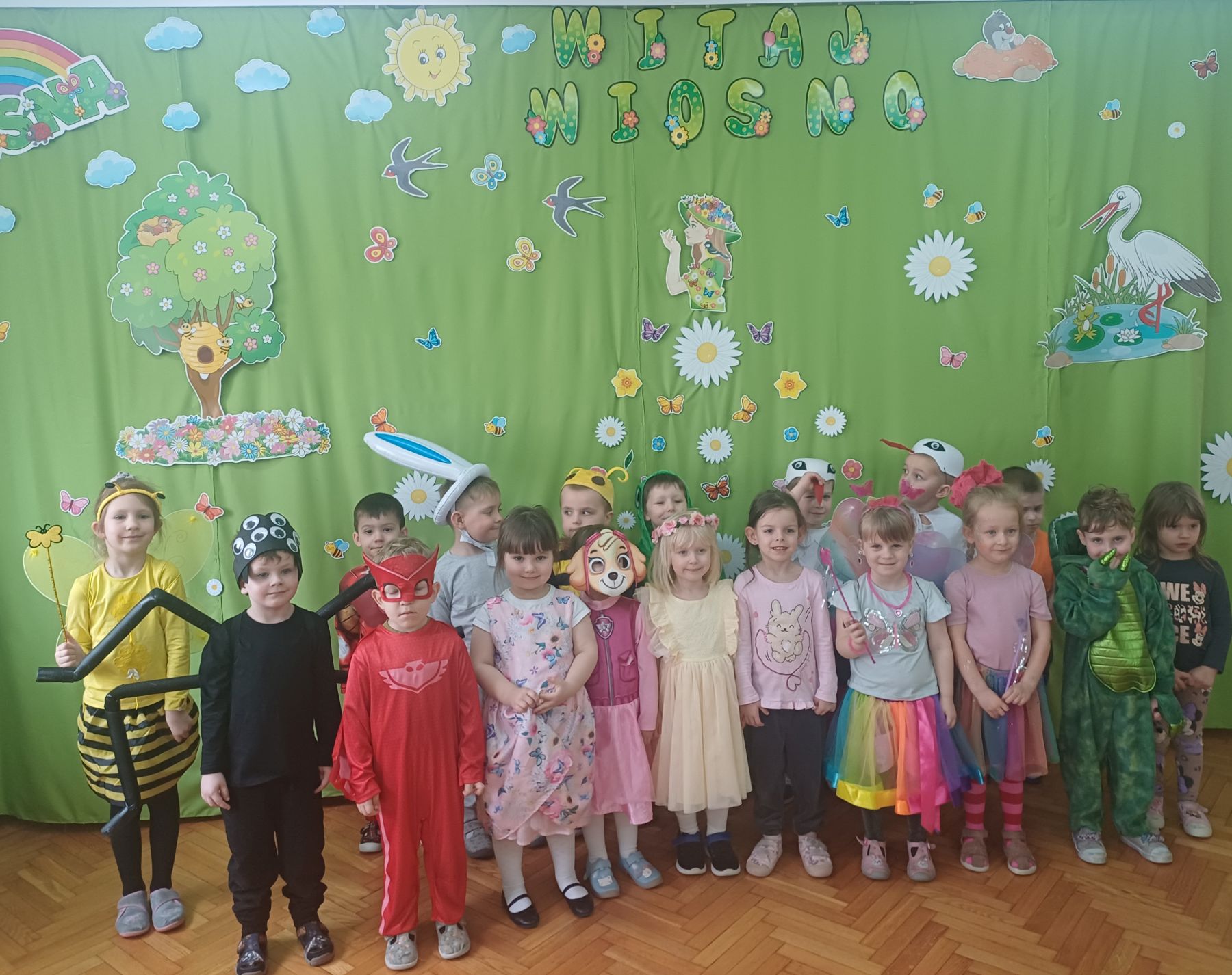 W tym dniu dzieci przybyły do przedszkola przebrane w stroje związane z ta piękną porą roku. Wśród nich można było spotkać Panią Wiosnę, żabki, bociany, motylki, biedronki, pszczółki i kolorowe kwiaty. Sala była barwnie przystrojona. Odbywały się różne wiosenne tańce, zabawy, konkurencje, konkursy, które przysparzały dzieciom wielu wrażeń i zadowolenia. W tym dniu wszędzie królowała Pani Wiosna, a na dziecięcych twarzach gościły przepiękne uśmiechy.