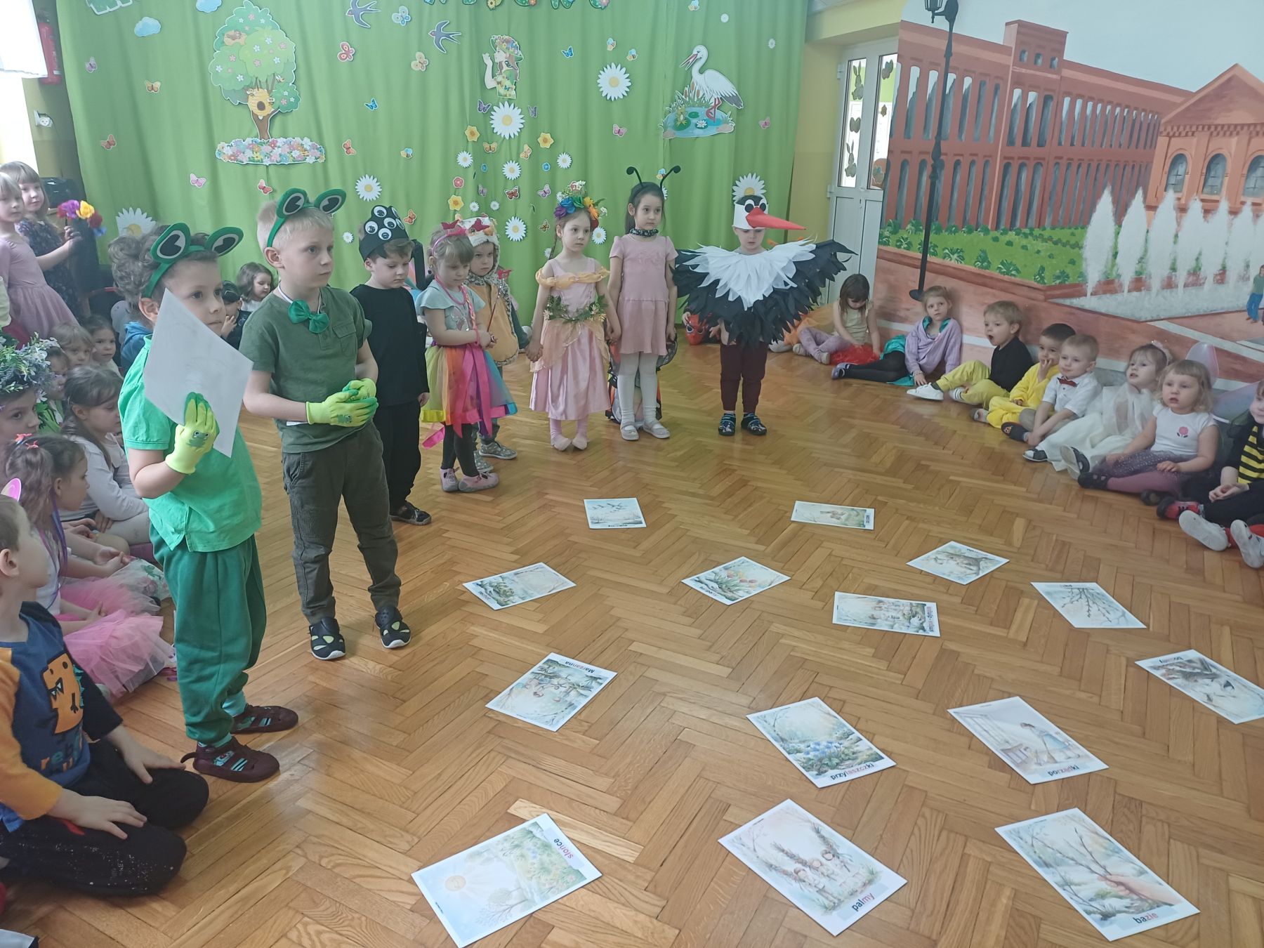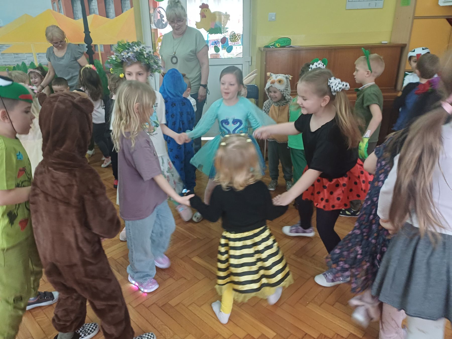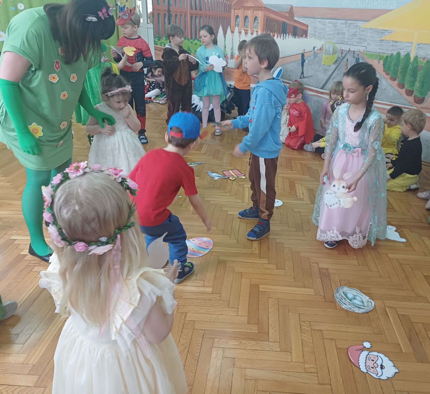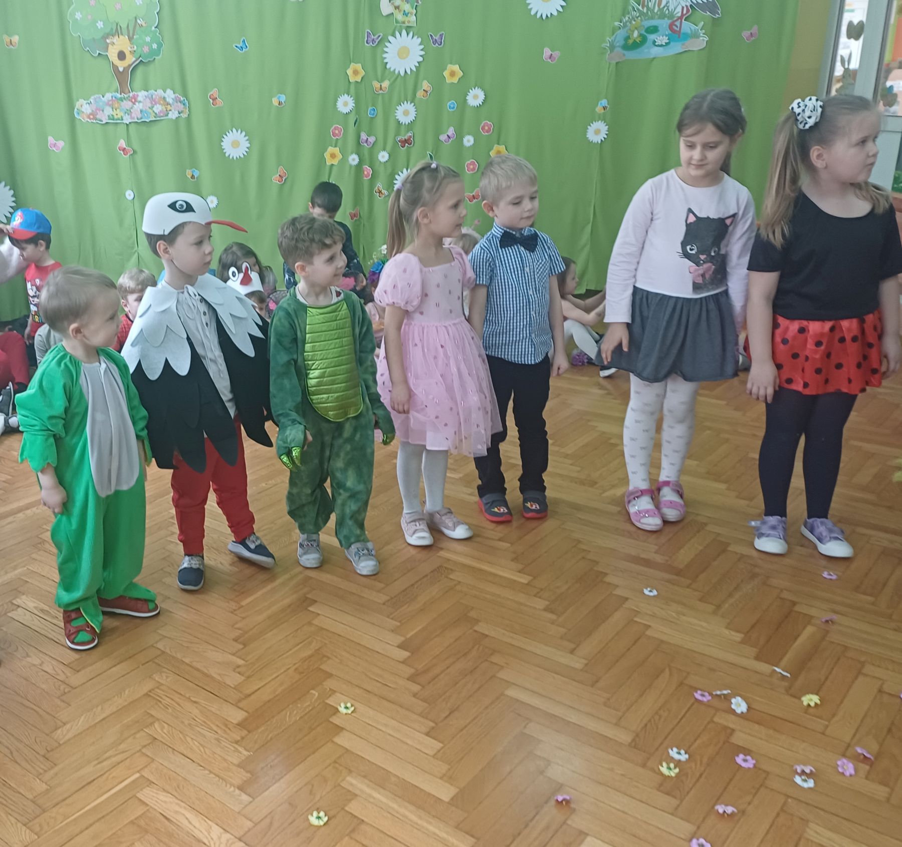 W tym dniu dzieci przybyły do przedszkola przebrane w stroje związane z ta piękną porą roku. Wśród nich można było spotkać Panią Wiosnę, żabki, bociany, motylki, biedronki, pszczółki i kolorowe kwiaty. Sala była barwnie przystrojona. Odbywały się różne wiosenne tańce, zabawy, konkurencje, konkursy, które przysparzały dzieciom wielu wrażeń i zadowolenia. W tym dniu wszędzie królowała Pani Wiosna, a na dziecięcych twarzach gościły przepiękne uśmiechy.