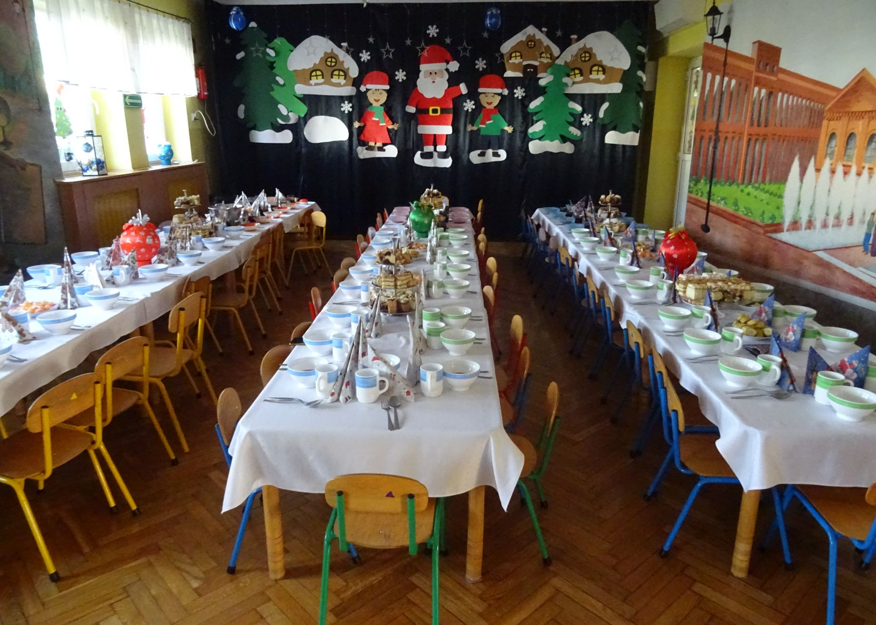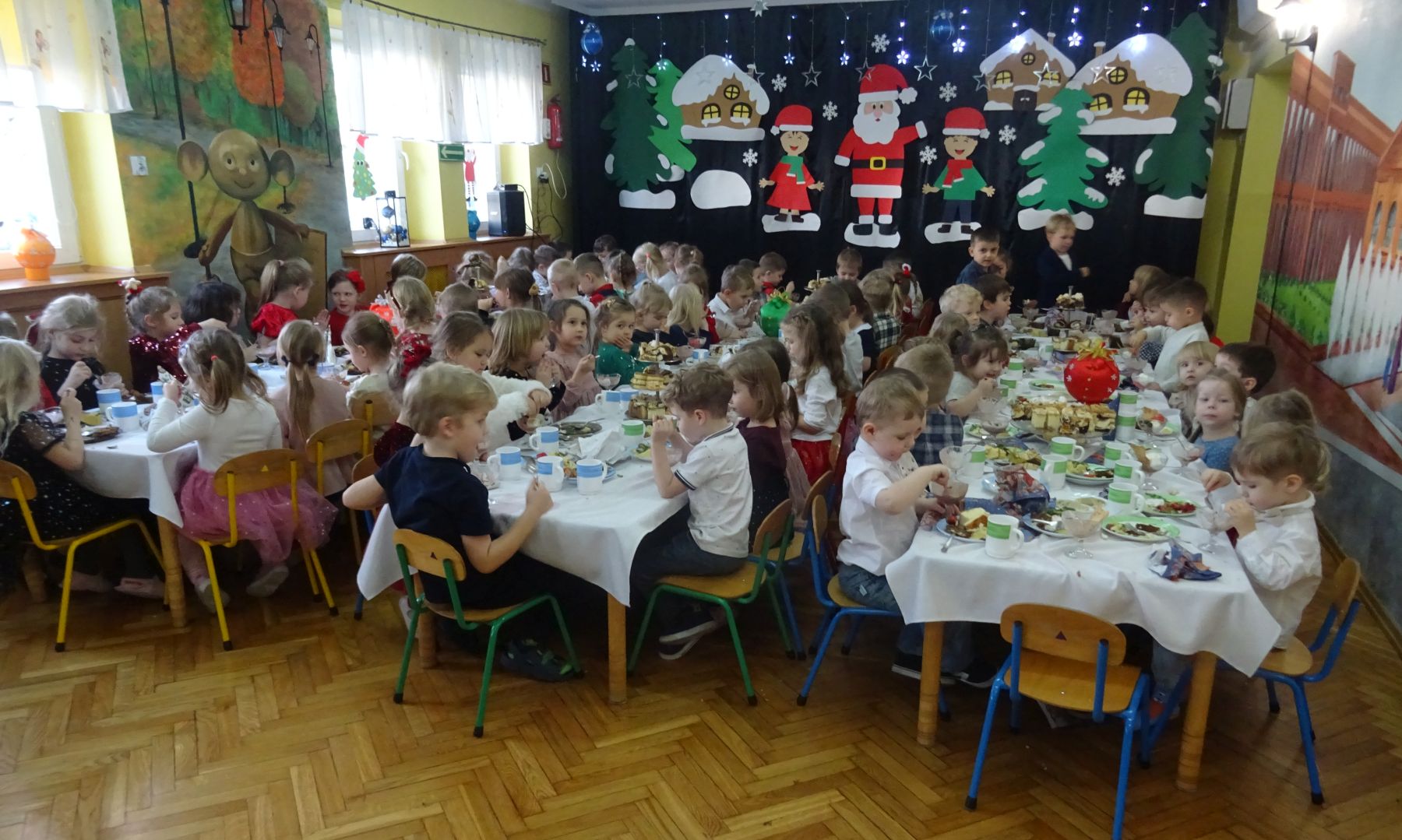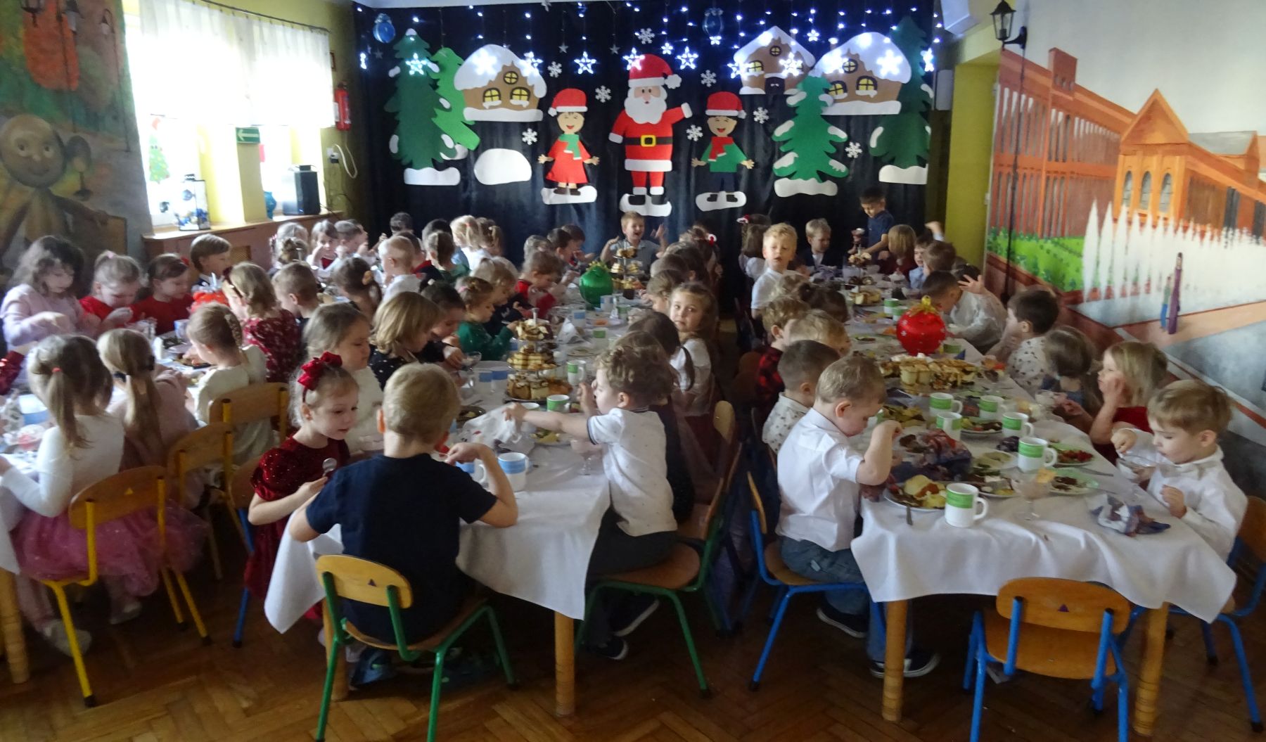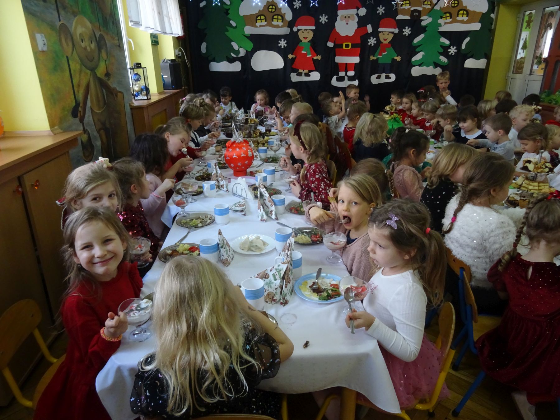Wspólny świąteczny obiad dzieci i pracowników przedszkola to tradycja, która na stałe weszła do kalendarza wydarzeń w naszym przedszkolu. To wyjątkowy dzień i wyjątkowy klimat. I tak dnia 17 grudnia 2025 r. wszyscy odświętnie ubrani, zajęliśmy miejsca za stołami nakrytymi białymi obrusami, na których znajdowały się pyszne, świąteczne potrawy, które spożywaliśmy przy dźwiękach kolęd. Najlepszym sposobem uczenia się i zdobywania nowych doświadczeń jest przykład, kultywowanie tradycji i przekazywanie ich z pokolenia na pokolenie. Jeszcze raz życzymy wszystkim Wesołych Świąt!!!