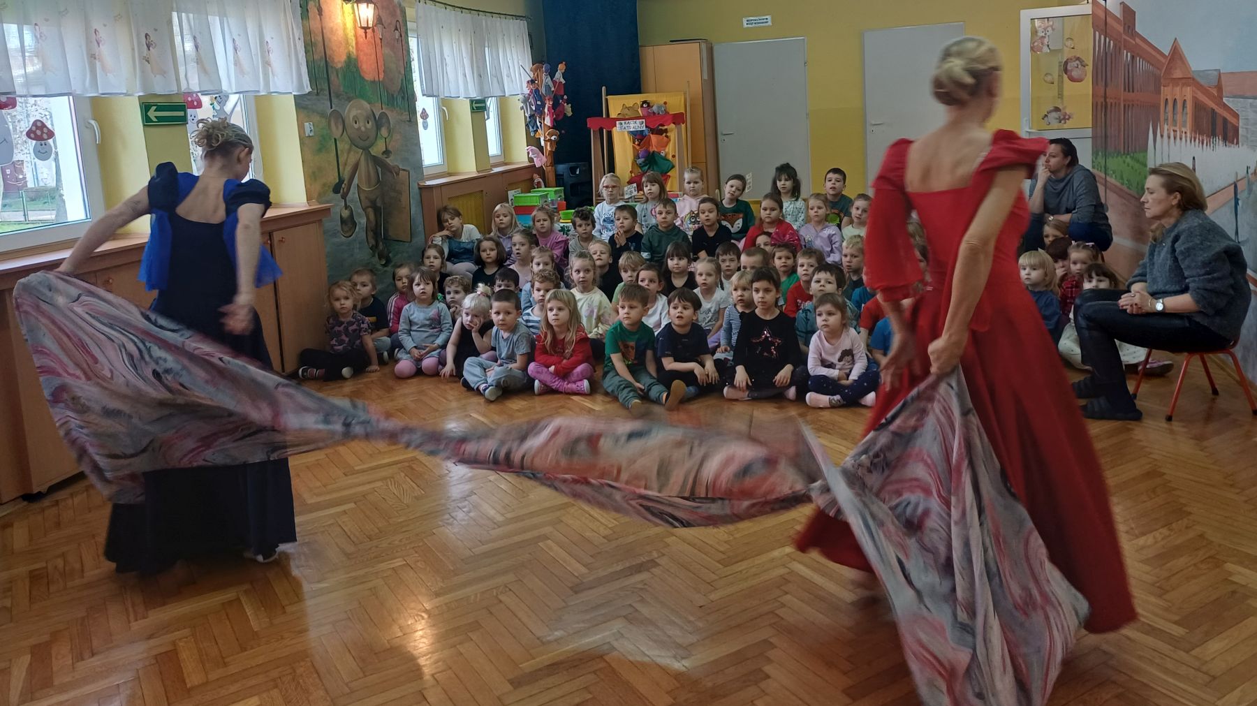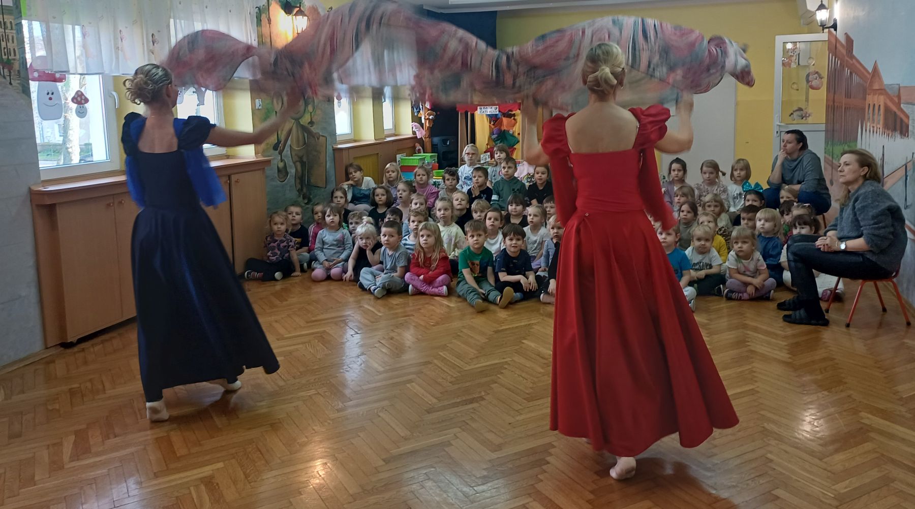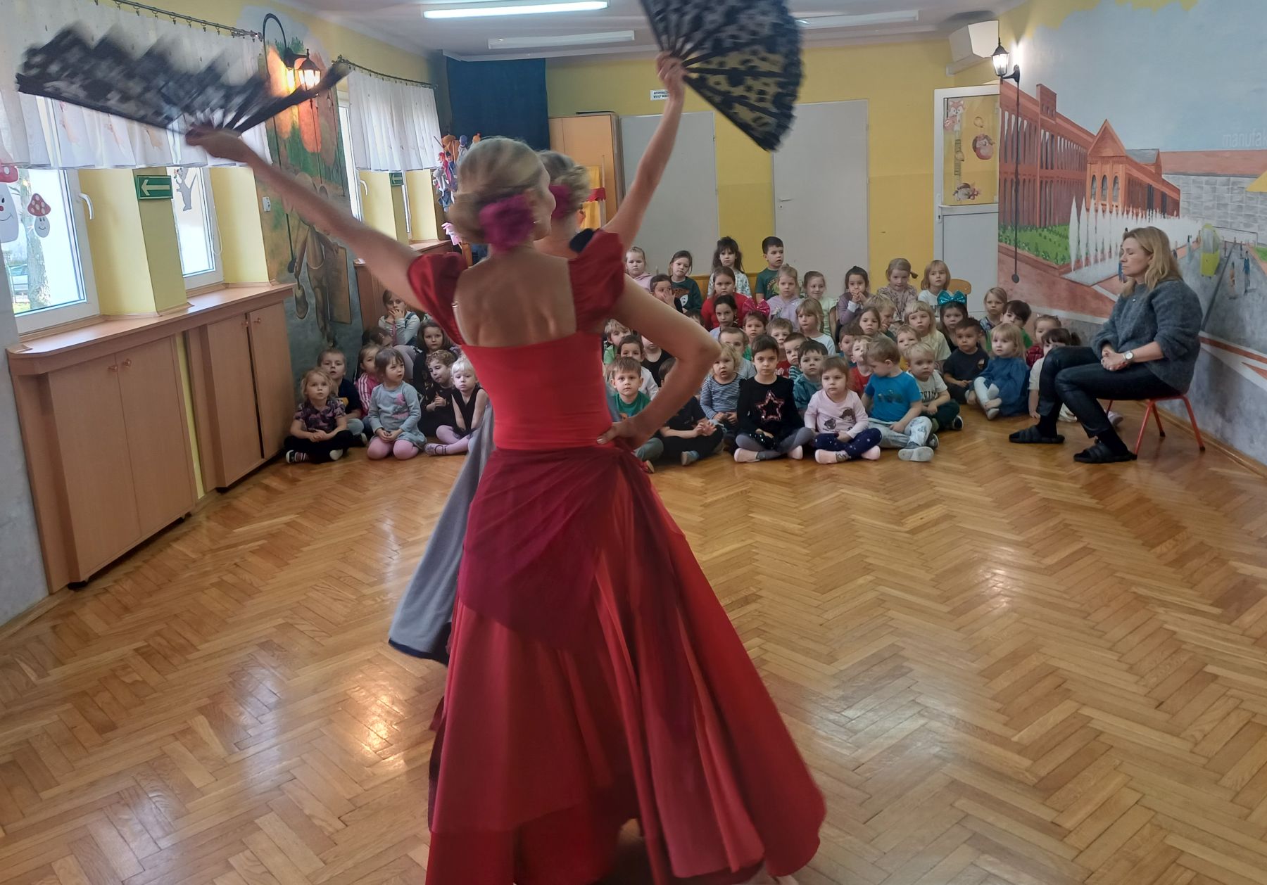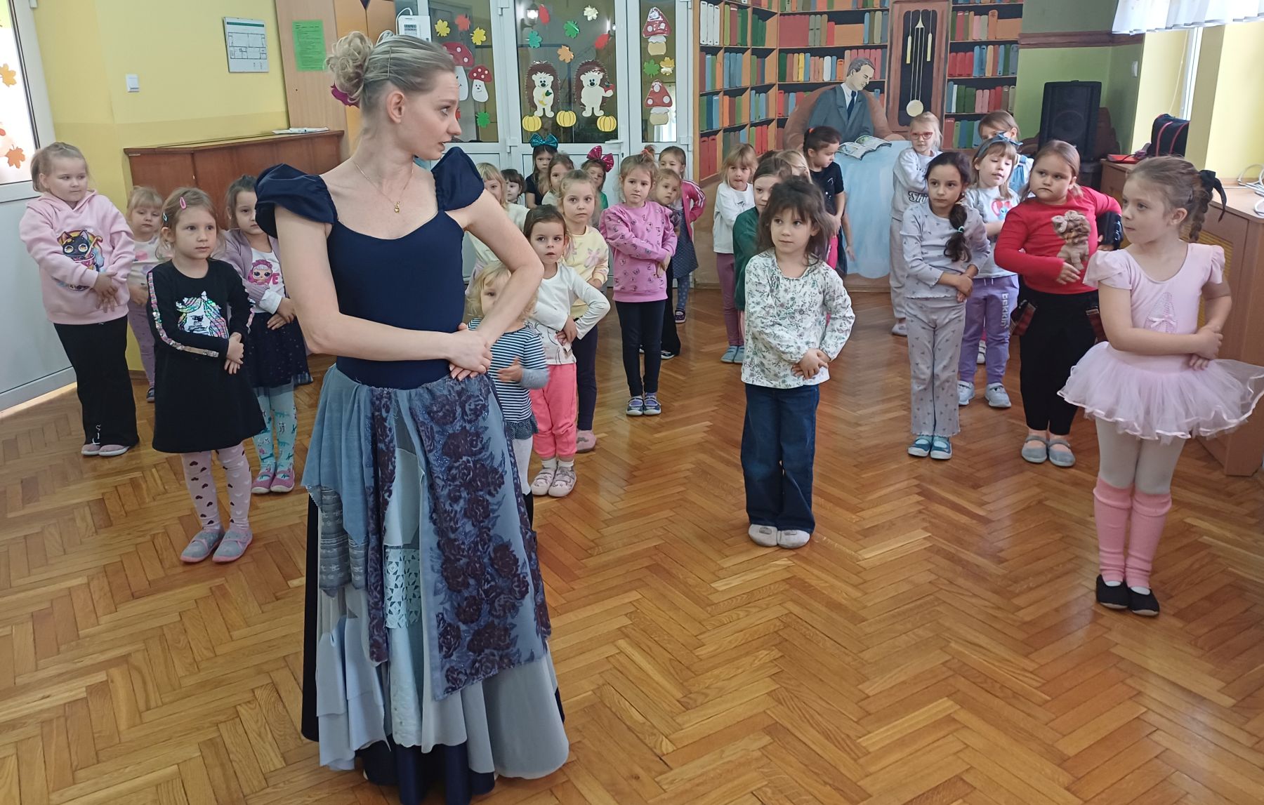 Dnia 13 listopada 2025 r. odbyło się spotkanie baletowe pt. „Tańce z oper”. Artyści baletu wprowadzili nas w zaczarowany świat oper. Podziwialiśmy różne tańce z baletu klasycznego. Baletnice zaprezentowały nam między innymi taniec „Carmen” i „Aidy”, w którym mogliśmy podziwiać różne ewolucje baletowe, piruety i skoki. Dzieci poznały stroje oraz rekwizyty niezbędne do prezentacji wybranych choreografii np. piękne wachlarze. Przedszkolaki miały również możliwość wypróbowania swoich sił w tańcu z chustą. Wspólny taniec sprawił nam wiele radości.