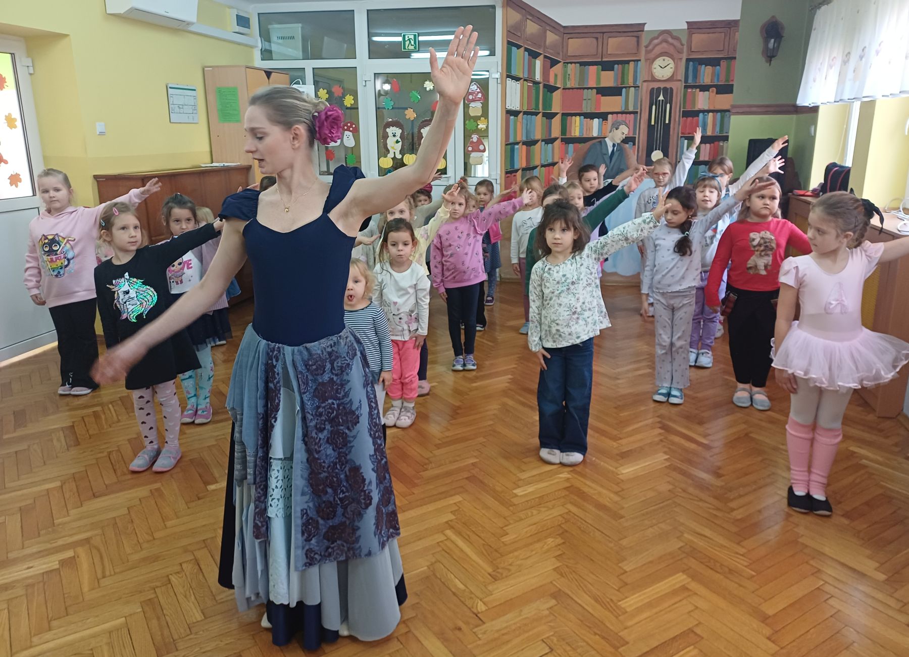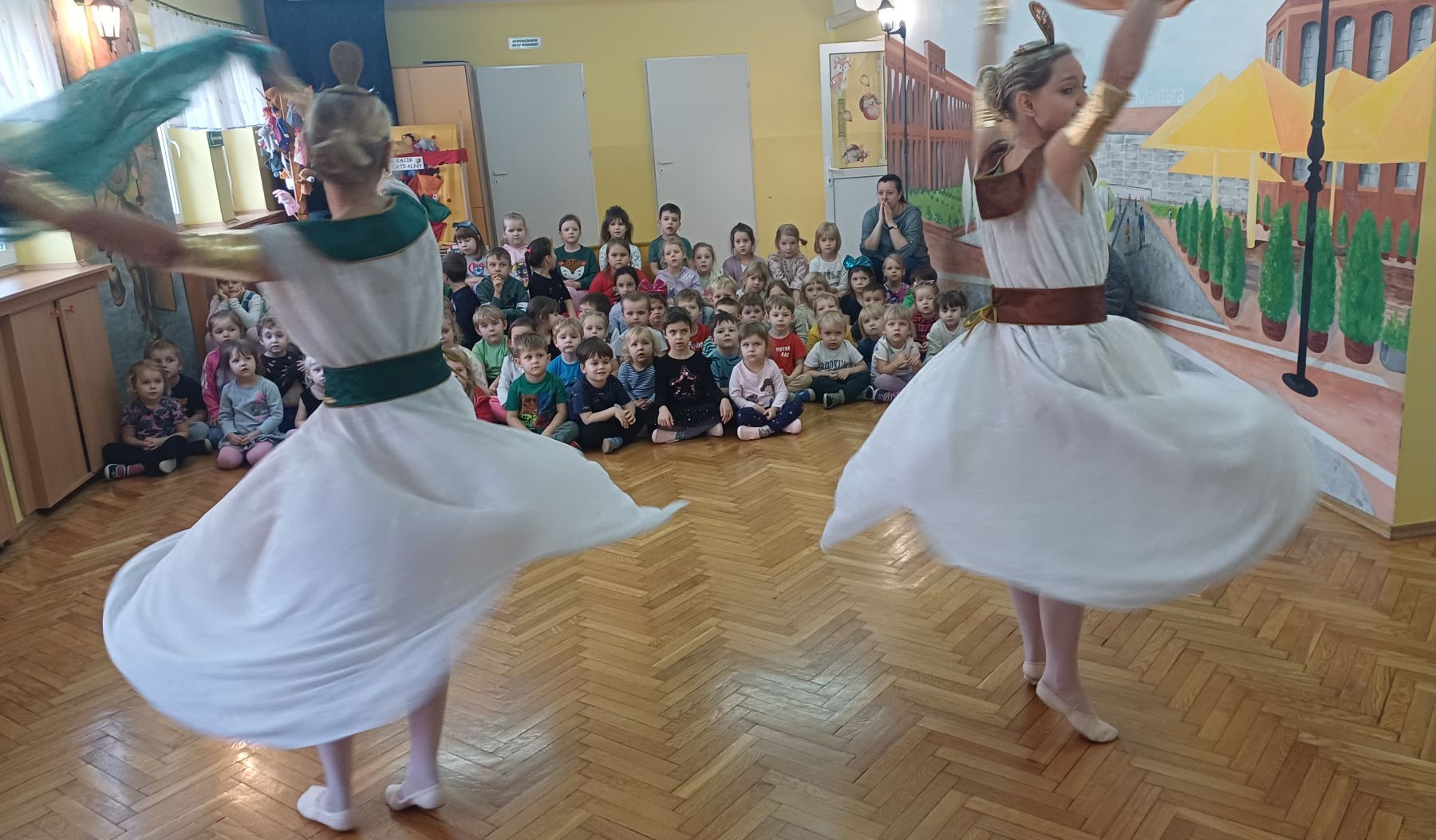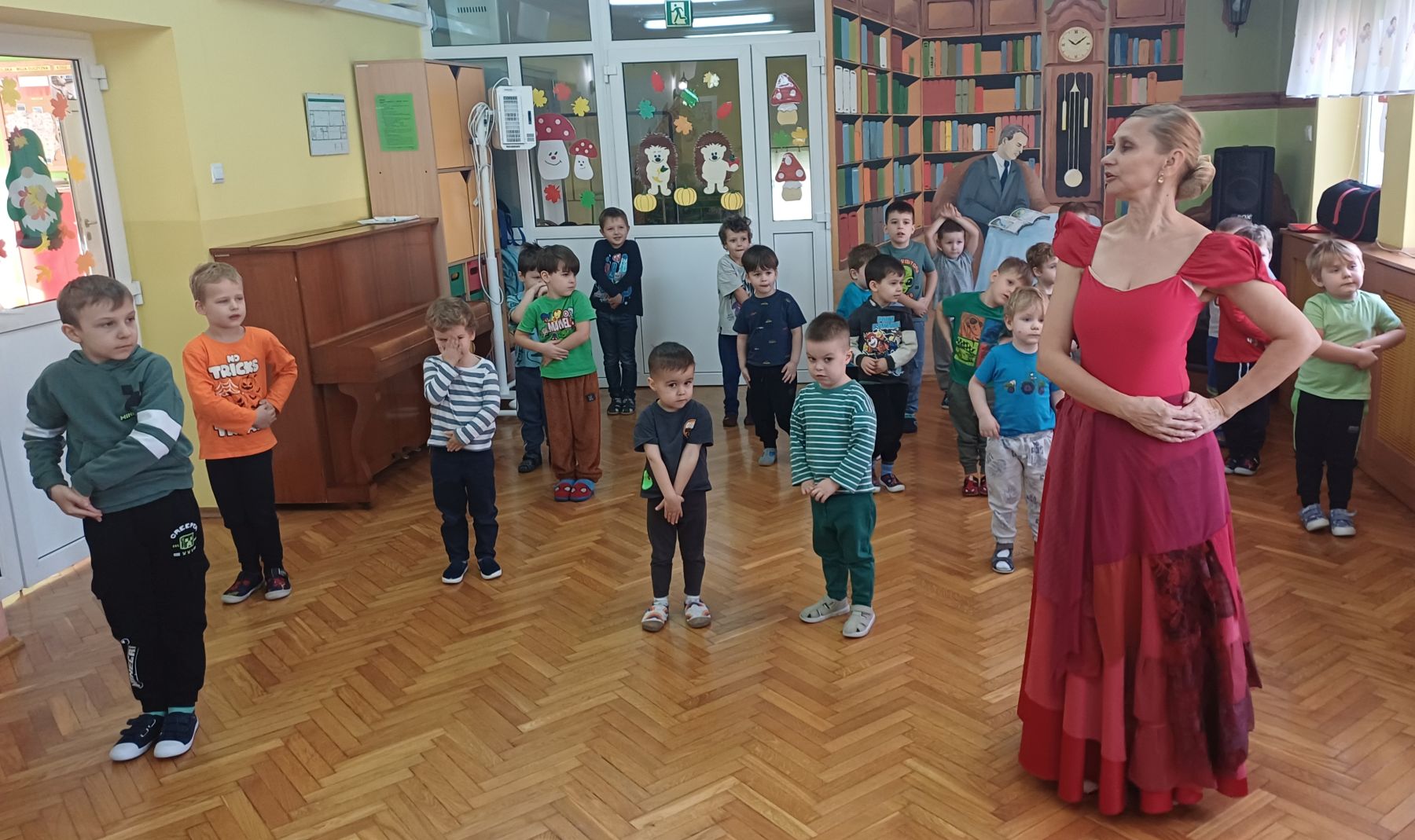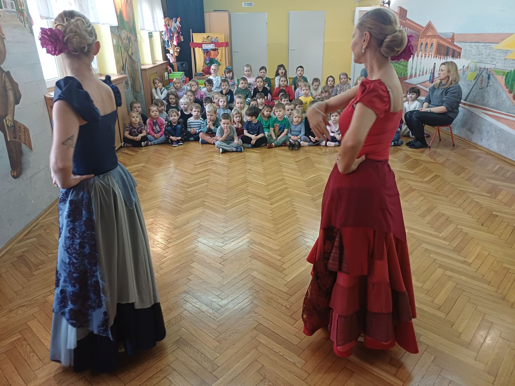 Dnia 13 listopada 2025 r. odbyło się spotkanie baletowe pt. „Tańce z oper”. Artyści baletu wprowadzili nas w zaczarowany świat oper. Podziwialiśmy różne tańce z baletu klasycznego. Baletnice zaprezentowały nam między innymi taniec „Carmen” i „Aidy”, w którym mogliśmy podziwiać różne ewolucje baletowe, piruety i skoki. Dzieci poznały stroje oraz rekwizyty niezbędne do prezentacji wybranych choreografii np. piękne wachlarze. Przedszkolaki miały również możliwość wypróbowania swoich sił w tańcu z chustą. Wspólny taniec sprawił nam wiele radości.