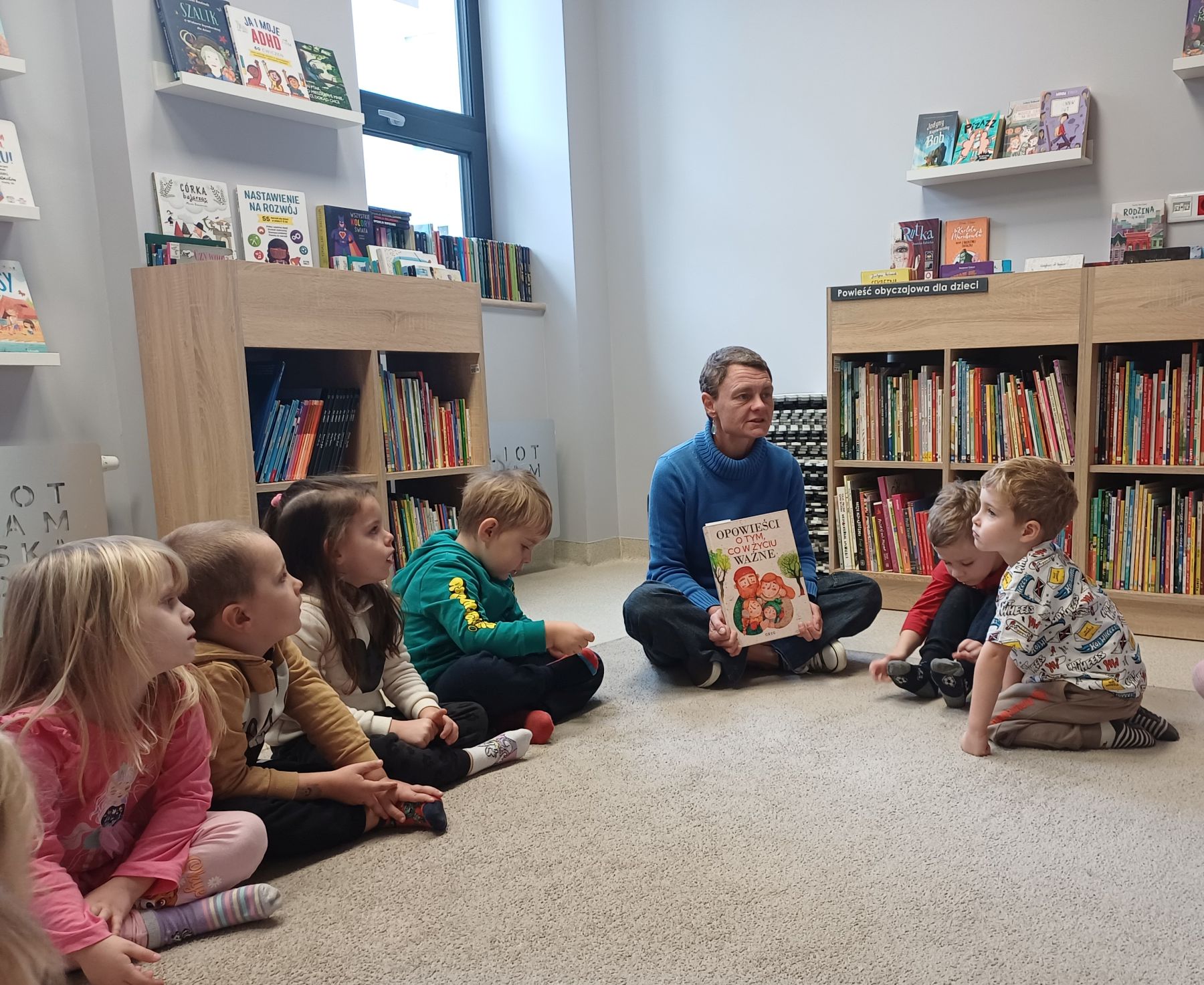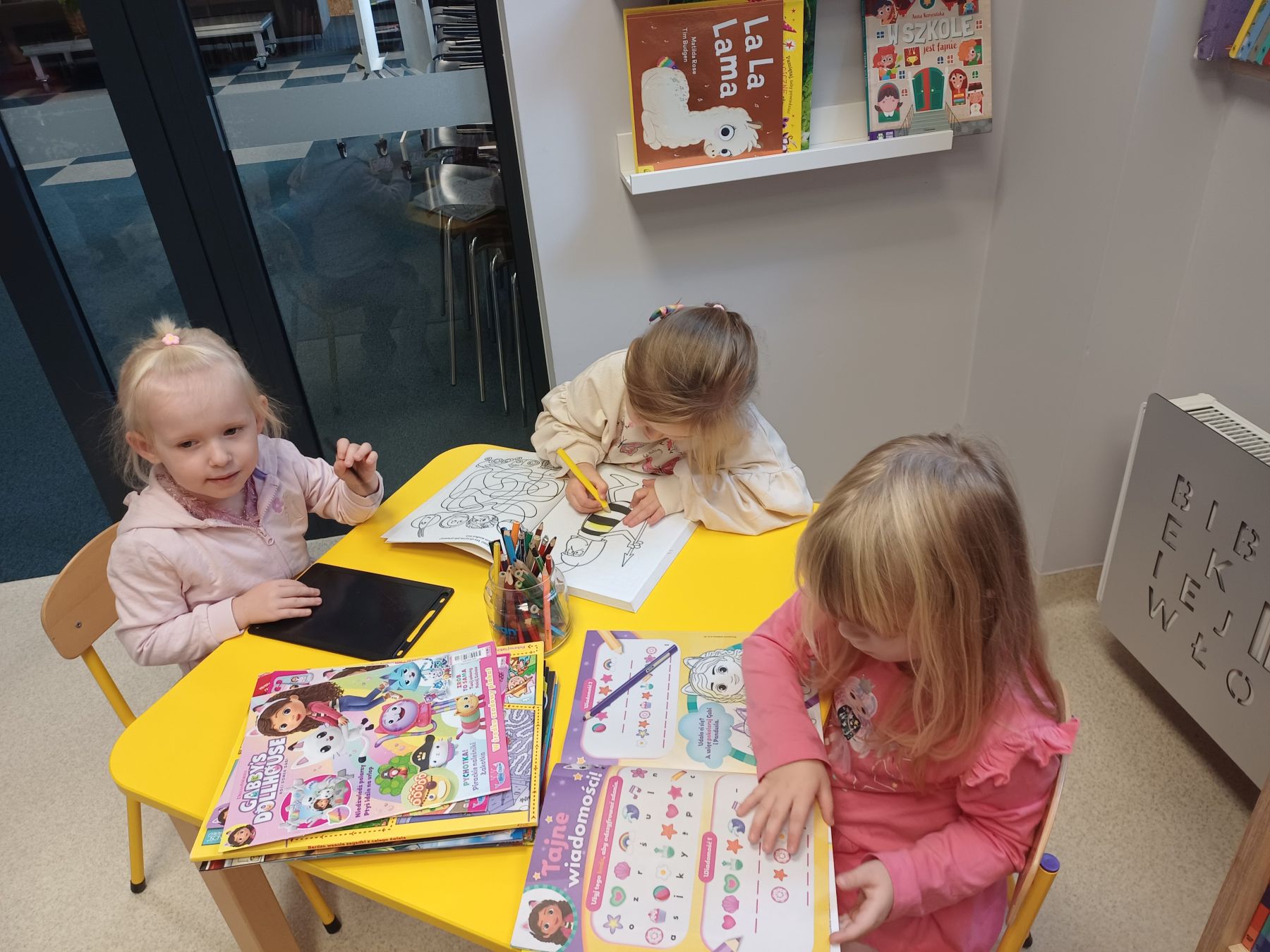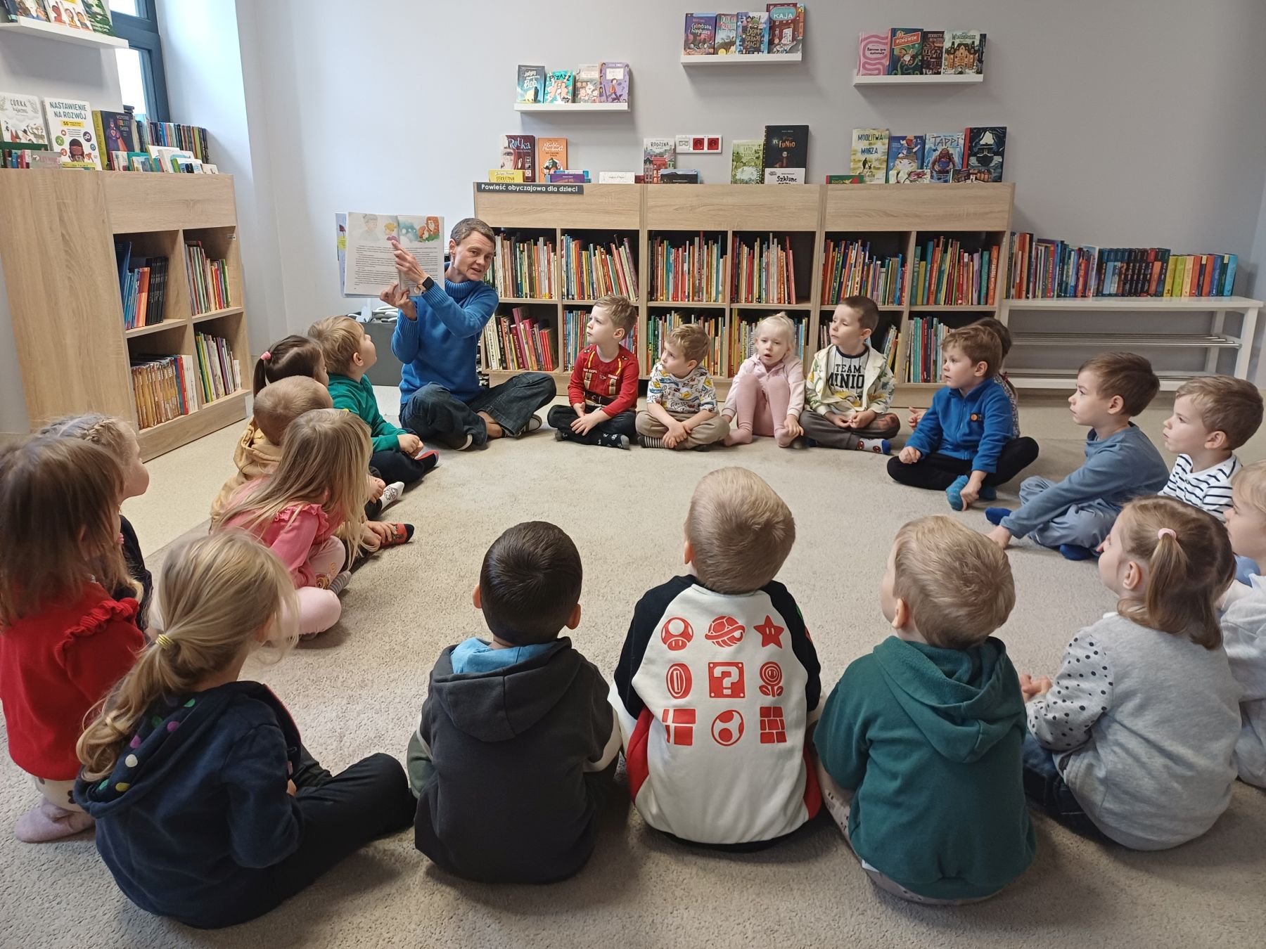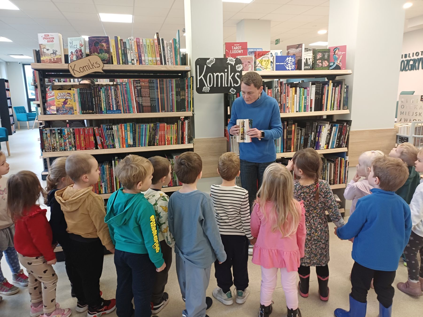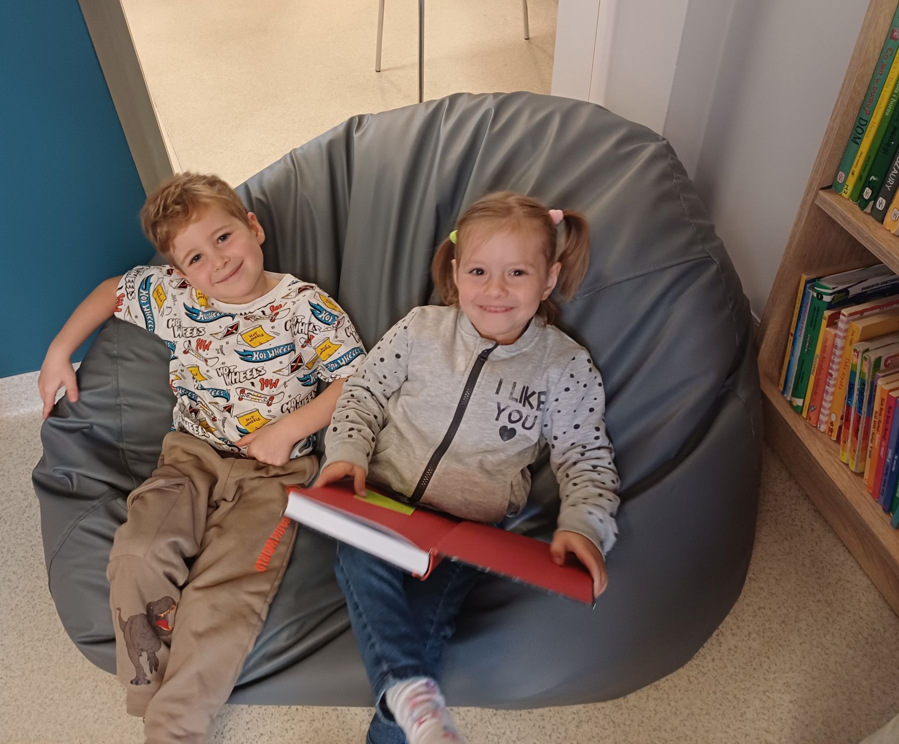 Dnia 01 października 2025 r. przedszkolaki z gr. II udały się do Miejskiej Biblioteki "Rozgrywka". Celem wyjścia było rozbudzenie zainteresowań czytelniczych dzieci oraz kształtowanie poczucia szacunku dla książek. Pani bibliotekarka w przystępny sposób opowiadała o bibliotece i o zbiorach znajdujących się na półkach. Dzieci zobaczyły jak wygląda karta czytelnika oraz poznały zasady wypożyczania książek. Dzieci wzięły również udział w lekcji bibliotecznej podczas której, min. słuchały opowiadania pt. "Opowieści o tym, co w życiu ważne". Przedszkolakom wycieczka do biblioteki bardzo się podobała.