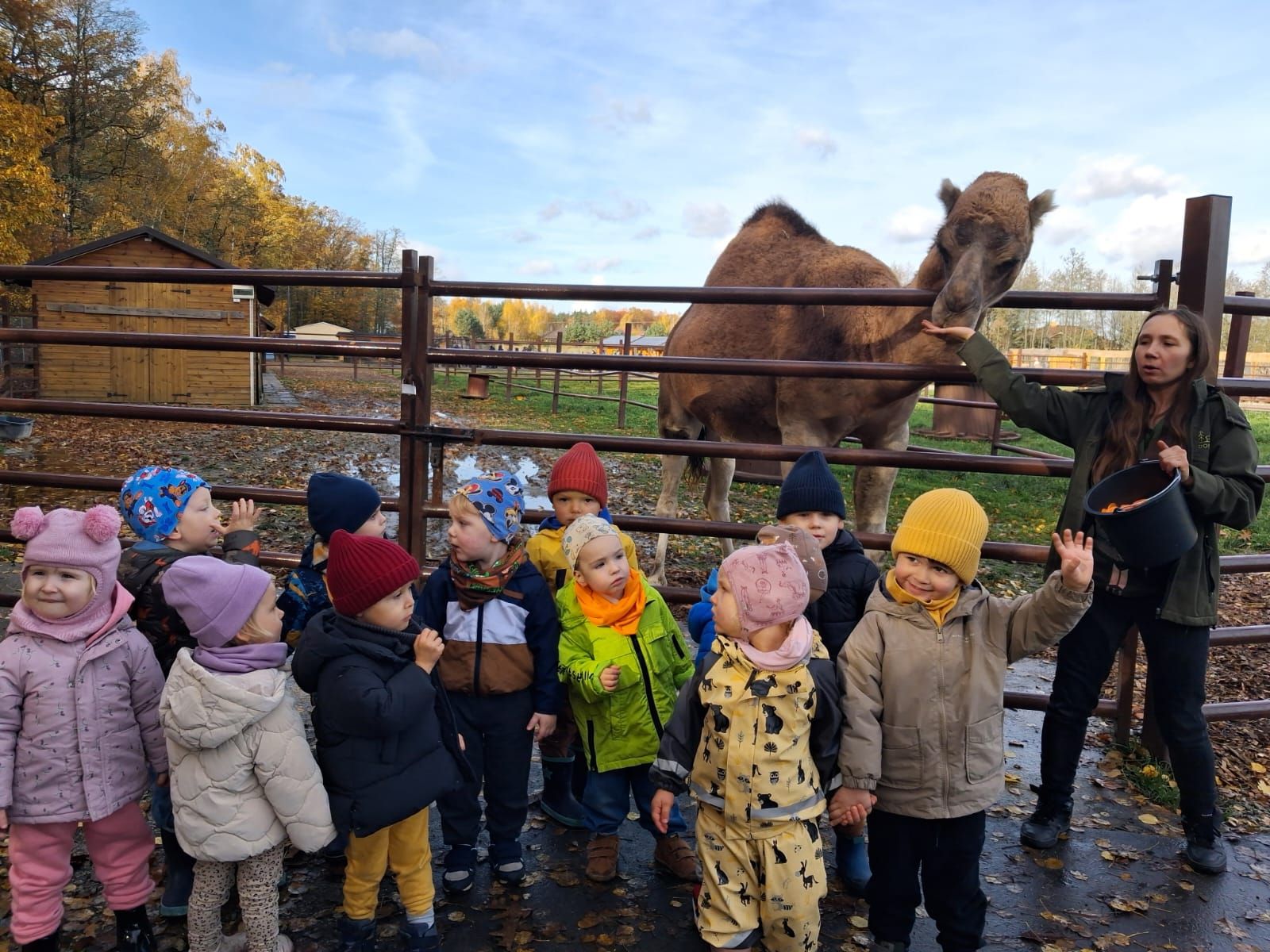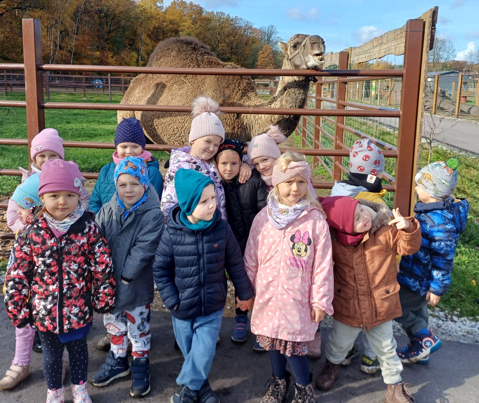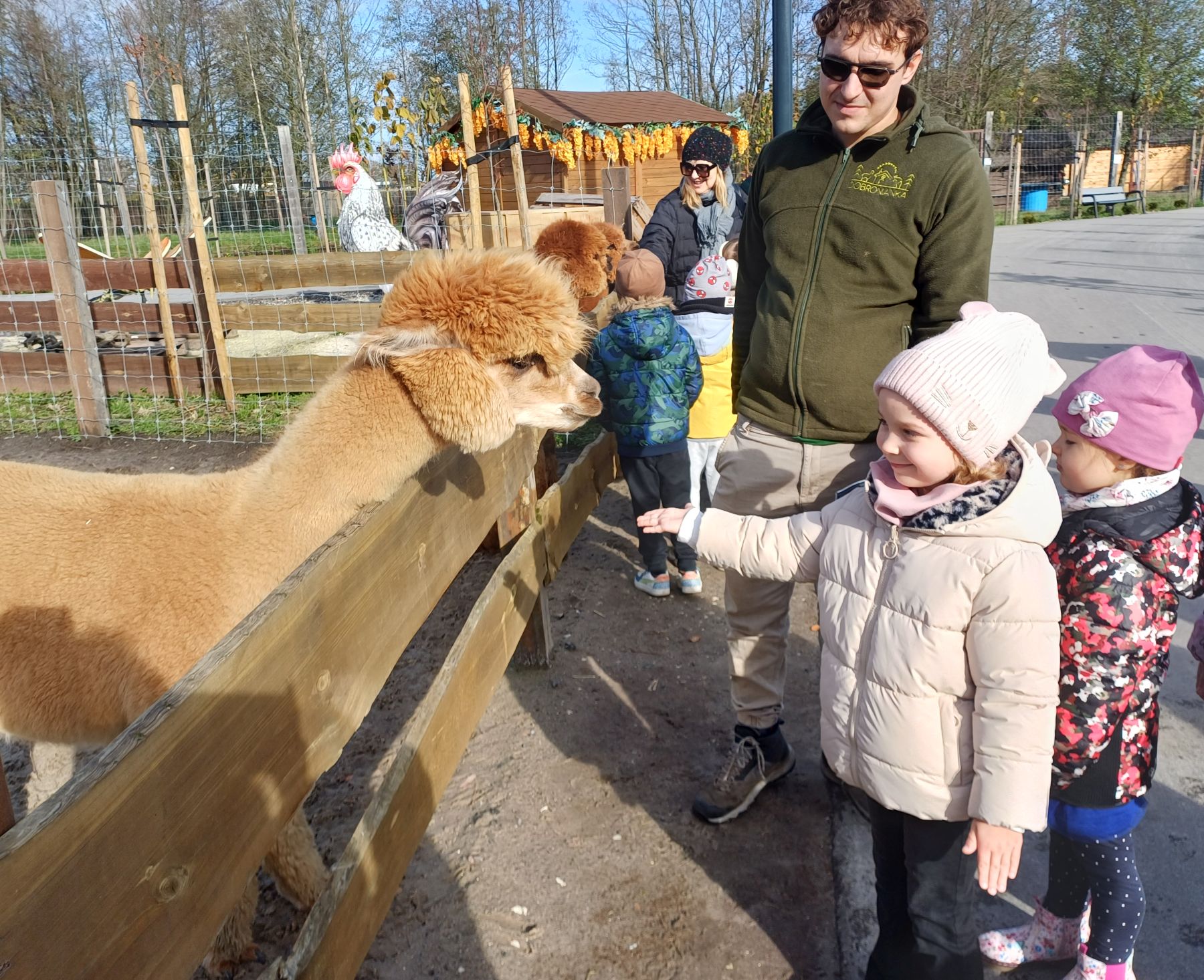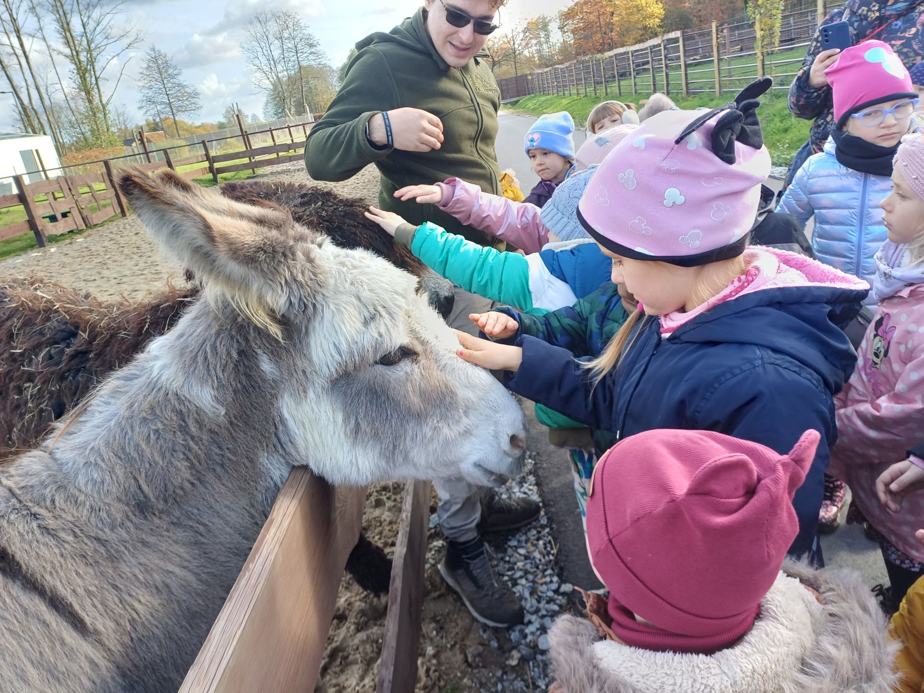W dniu 29 października 2025 r. dzieci wybrały się na wycieczkę do Mini Zoo Dobronianka w Dobroniu. Celem wycieczki były: obserwacja i czerpanie pozytywnych wrażeń w kontakcie z przyrodą, zainteresowanie różnorodnością gatunków świata zwierząt oraz kształtowanie świadomości ekologicznej. Przedszkolaki miały możliwość poznać różne zwierzęta np. alpaki, kozy, konie, wielbłądy, osły, mary, króliki, pawie i wiele innych, a także karmić niektóre z nich marchewkami oraz wysłuchać ciekawostek na ich temat od przewodników. Po zwiedzaniu zoo udaliśmy się na smaczny posiłek. Pobyt w zoo dostarczył najmłodszym wiele radości oraz był wspaniałą lekcją przyrody przeżytą w ciekawym i atrakcyjnym miejscu. Ach... cóż to był za dzień!