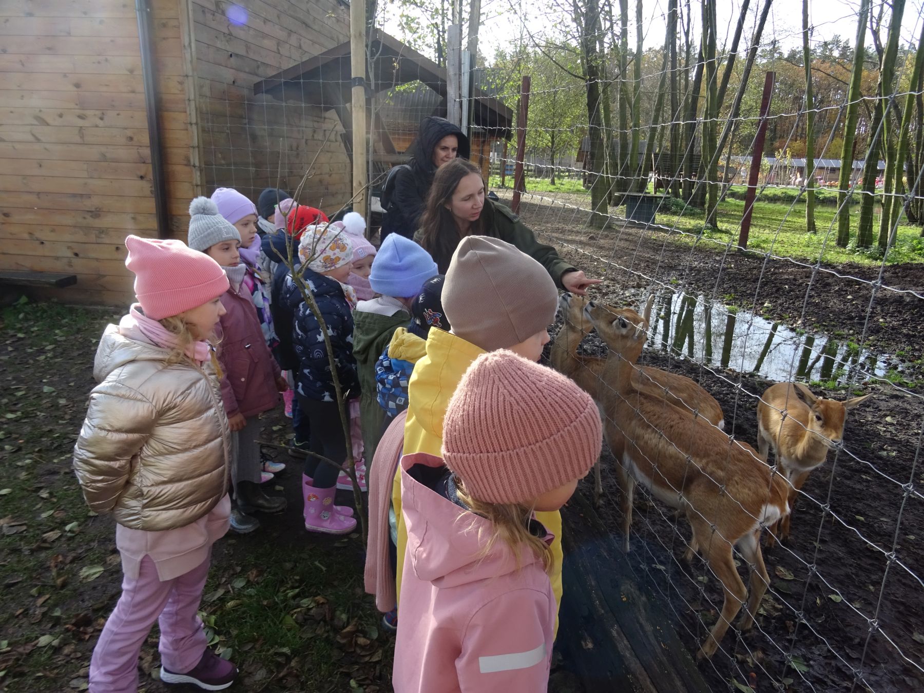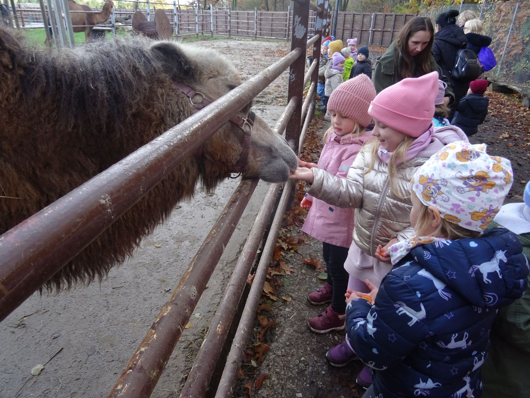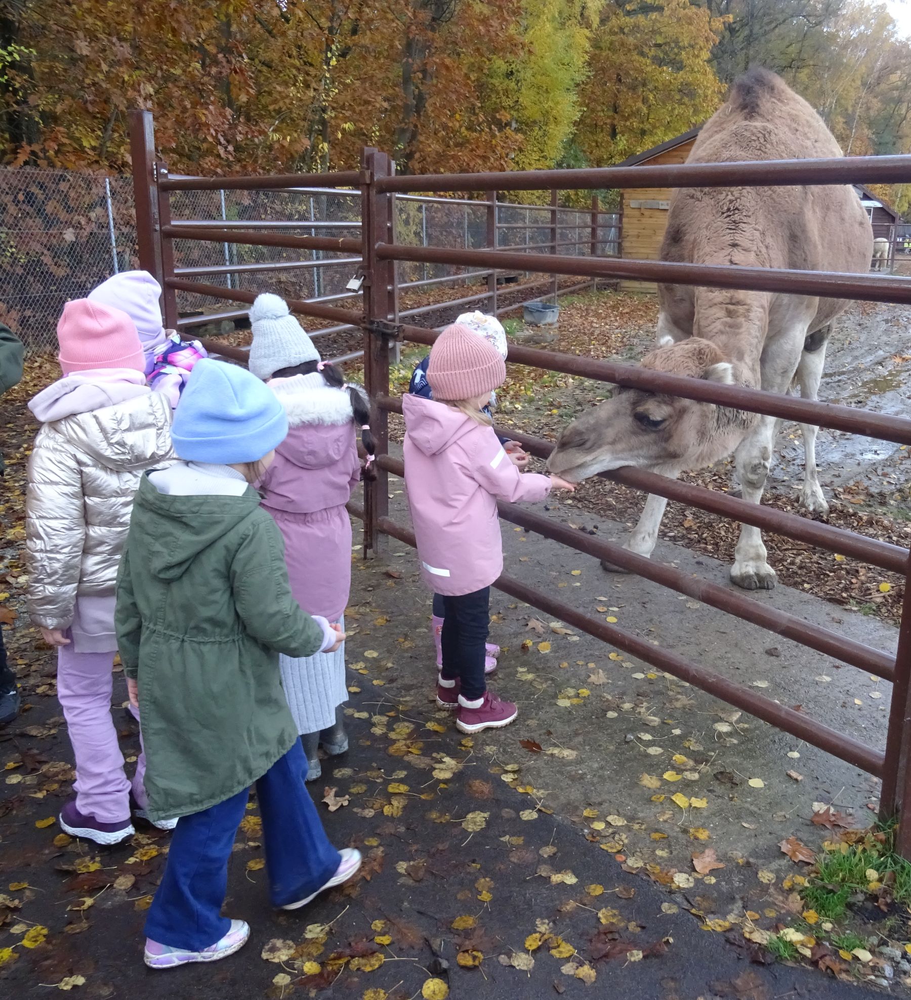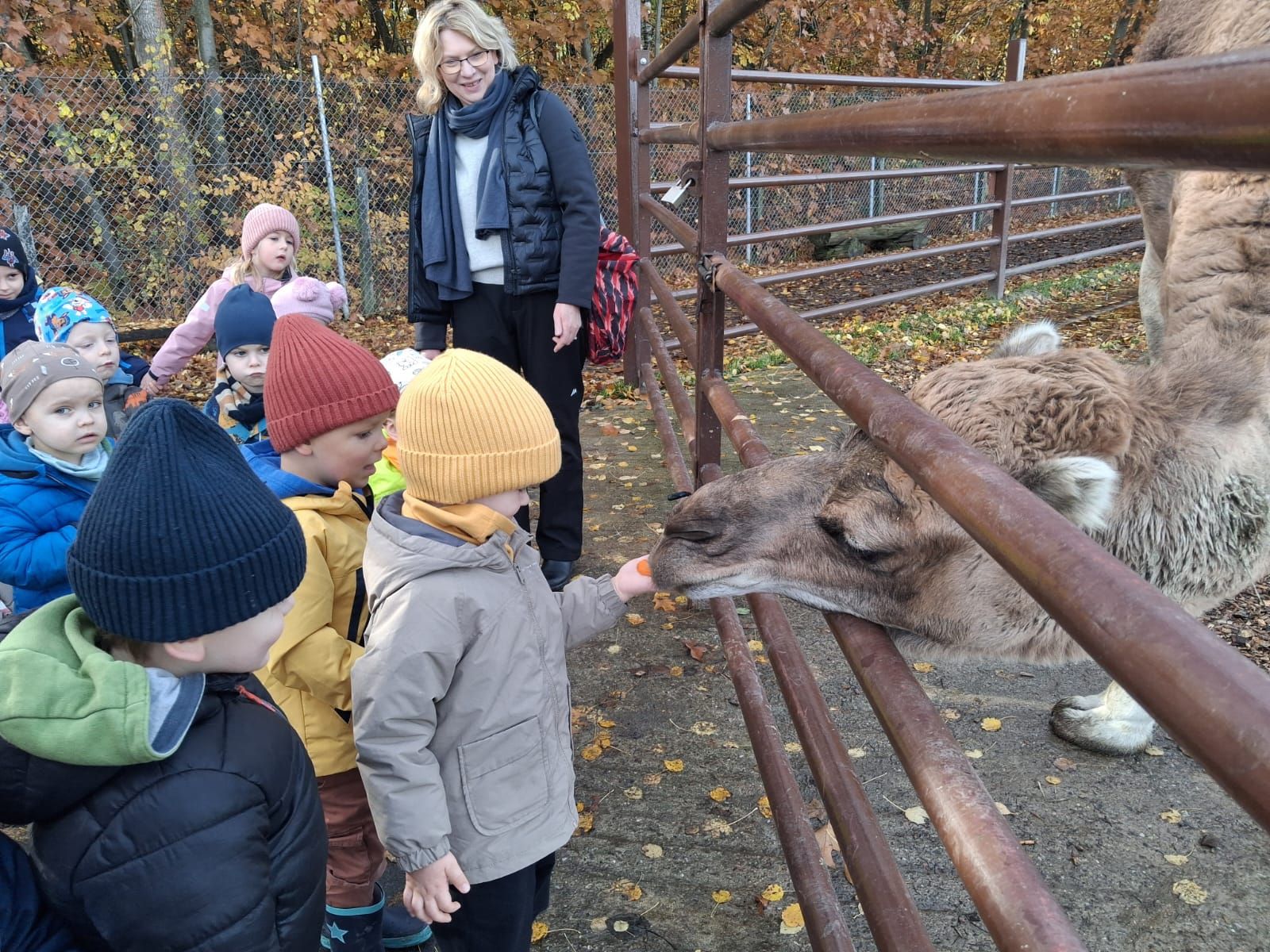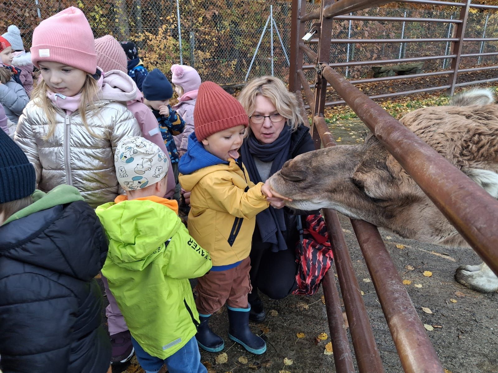 W dniu 29 października 2025 r. dzieci wybrały się na wycieczkę do Mini Zoo Dobronianka w Dobroniu. Celem wycieczki były: obserwacja i czerpanie pozytywnych wrażeń w kontakcie z przyrodą, zainteresowanie różnorodnością gatunków świata zwierząt oraz kształtowanie świadomości ekologicznej. Przedszkolaki miały możliwość poznać różne zwierzęta np. alpaki, kozy, konie, wielbłądy, osły, mary, króliki, pawie i wiele innych, a także karmić niektóre z nich marchewkami oraz wysłuchać ciekawostek na ich temat od przewodników. Po zwiedzaniu zoo udaliśmy się na smaczny posiłek. Pobyt w zoo dostarczył najmłodszym wiele radości oraz był wspaniałą lekcją przyrody przeżytą w ciekawym i atrakcyjnym miejscu. Ach... cóż to był za dzień!